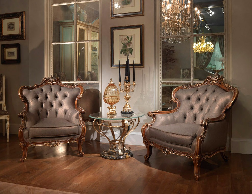 Fauteuil classique avec structure en bois massif et des tissus précieux couvrant.