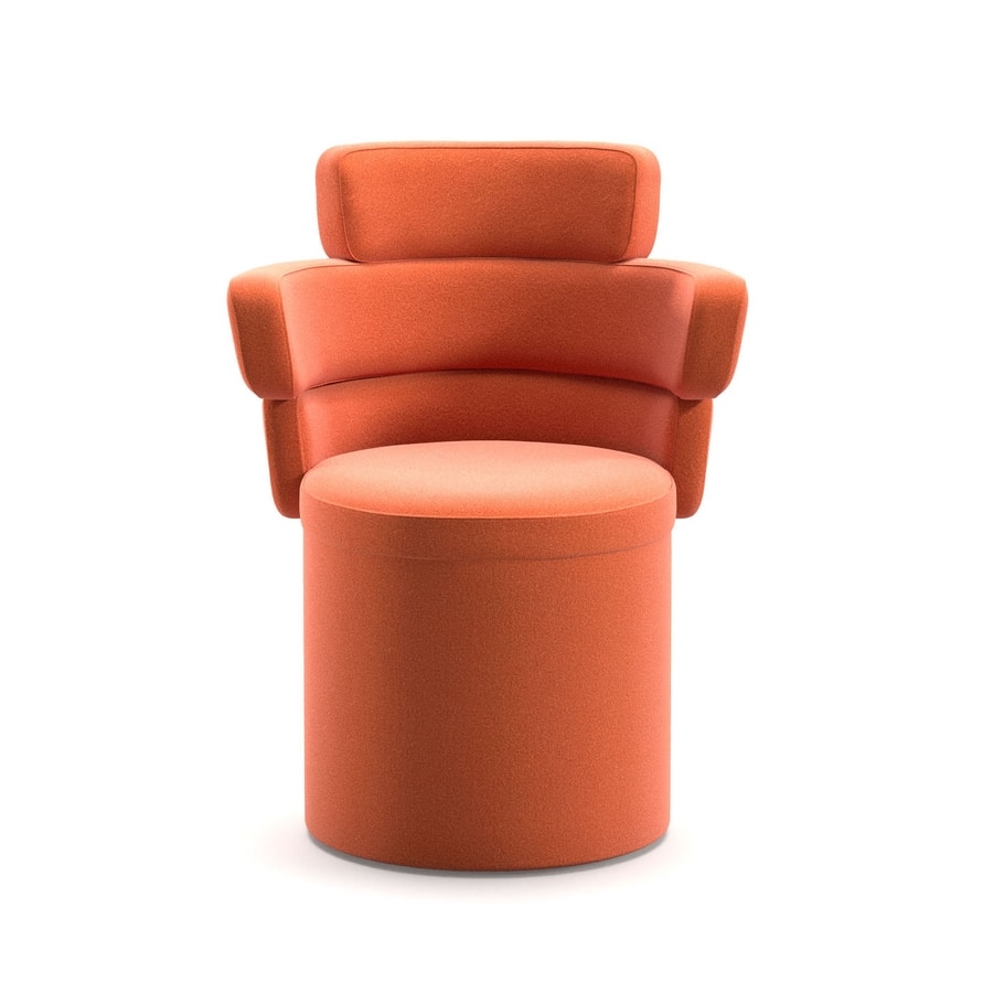 Dam est une collection de chaises rembourrées caractérisées par un dossier composé de deux bandes souples et enveloppantes jointes qui, en plus de fournir un soutien confortable dans la zone lombaire, servent d'accoudoirs. Le dossier et l'assise ronde et généreusement rembourrée sont soutenus par divers cadres en métal chromé, poli ou peint. Le petit fauteuil est disponible avec ou sans roulettes rotatives tandis que le tabouret pivotant à hauteur réglable est fourni avec une structure en acier inoxydable satiné et un repose-pieds chromé ou peint. Ce projet, qui allie esthétique et fonctionnalité, s'adapte à tous les types d'environnements, de l'intérieur de la maison à l'espace public.