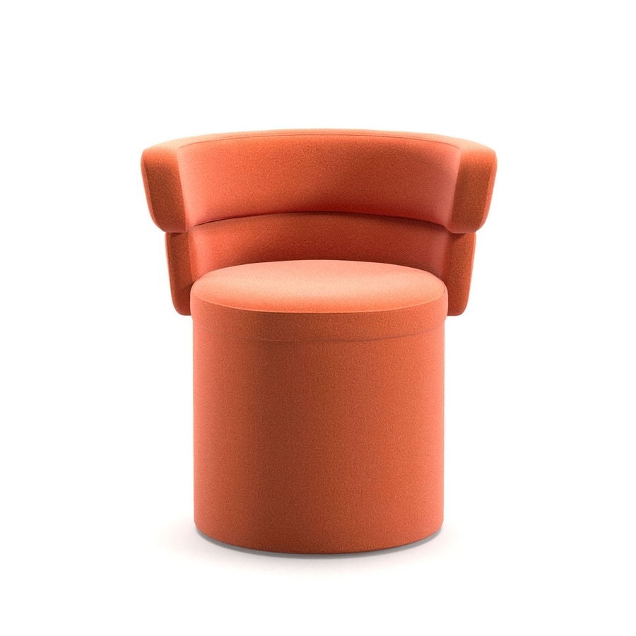 Dam est une collection de chaises rembourrées caractérisées par un dossier composé de deux bandes souples et enveloppantes jointes qui, en plus de fournir un soutien confortable dans la zone lombaire, servent d'accoudoirs. Le dossier et l'assise ronde et généreusement rembourrée sont soutenus par divers cadres en métal chromé, poli ou peint. Le petit fauteuil est disponible avec ou sans roulettes rotatives tandis que le tabouret pivotant à hauteur réglable est fourni avec une structure en acier inoxydable satiné et un repose-pieds chromé ou peint. Ce projet, qui allie esthétique et fonctionnalité, s'adapte à tous les types d'environnements, de l'intérieur de la maison à l'espace public.