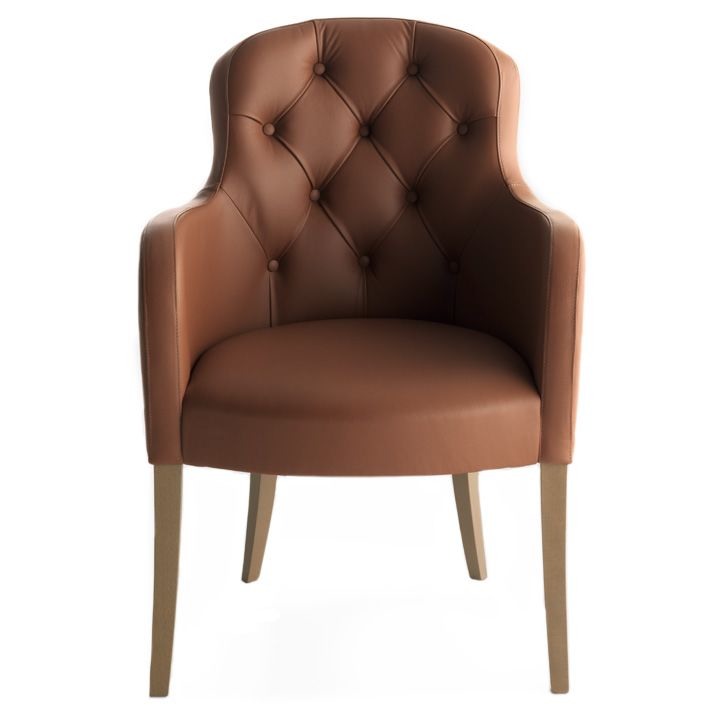 Petit fauteuil, structure en bois massif. Assise, dossier et accoudoirs rembourrés. Garniture du tour de l'assise. Assise avec sangles. Avant du dos avec rembourrage capitonné. Sans boutons de finition sur le dos extérieur mais possibilité sur demande avec supplément de prix.