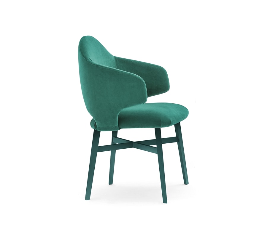 Cette chaise présente un dossier enveloppant qui enveloppe le bas de l’assise avec un système de fixation spécial et lui confère une forme unique et distinctive. Il vient avec la structure en bois ou en métal dans diverses finitions, avec la tapisserie d'ameublement en tissu ou en cuir.