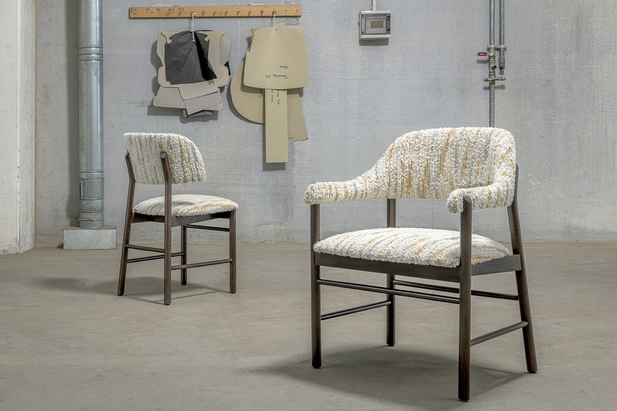 Fauteuil au design classique et intemporel, doté d'un dossier arrondi et accueillant et d'une structure en bois robuste, idéal pour les environnements hôteliers et médicaux. Le support arrière en bois du dossier, réalisé sans vis visibles, est un détail distinctif qui met en valeur son élégance et sa qualité artisanale.