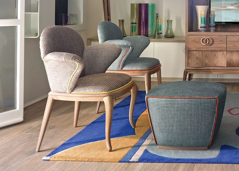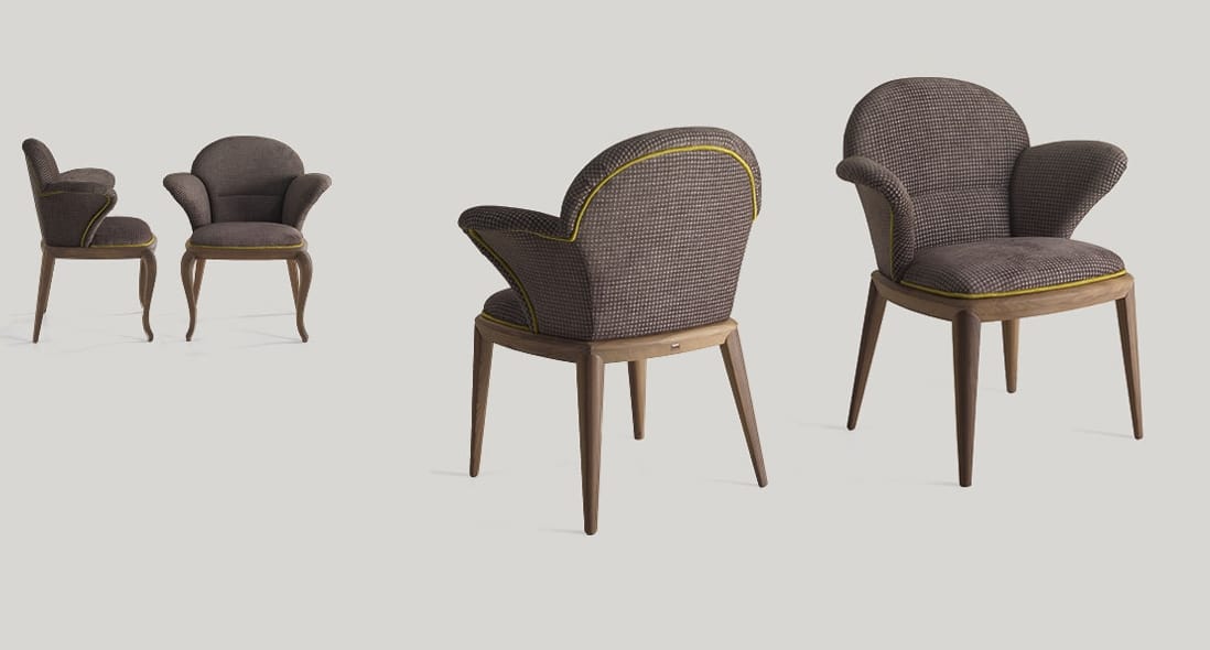 Chaise avec accoudoirs en saillie. Base en bois disponible avec des jambes coniques ou incurvées. Rembourrage personnalisable.