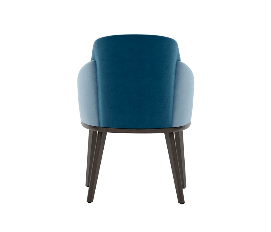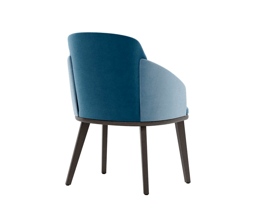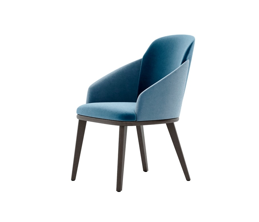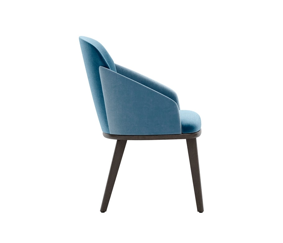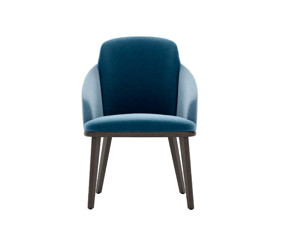 Fauteuil, structure d'assise aux bords arrondis et pieds triangulaires en bois massif. Coque avec ailerons en mousse injecté. Assise sanglé. Rembourrage sur la structure.