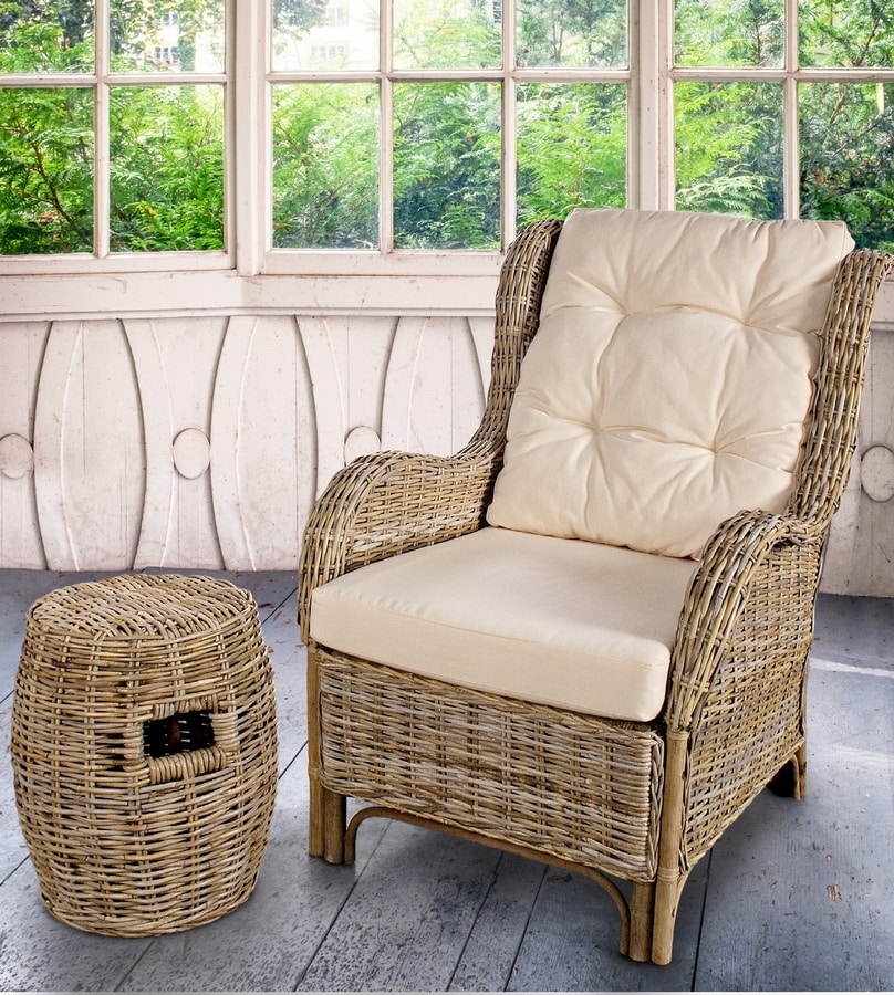 Détendez le fauteuil avec une structure en rotin et en osier kubu. Coussin de siège avec un rembourrage amovible, coussin de dossier matelassé, tous deux en polyester. Convient à la fois pour une utilisation intérieure et extérieure.
