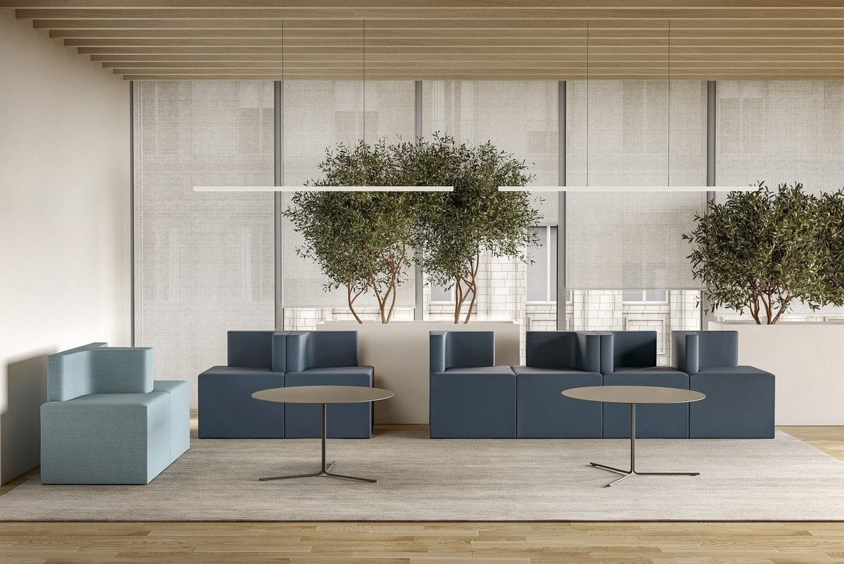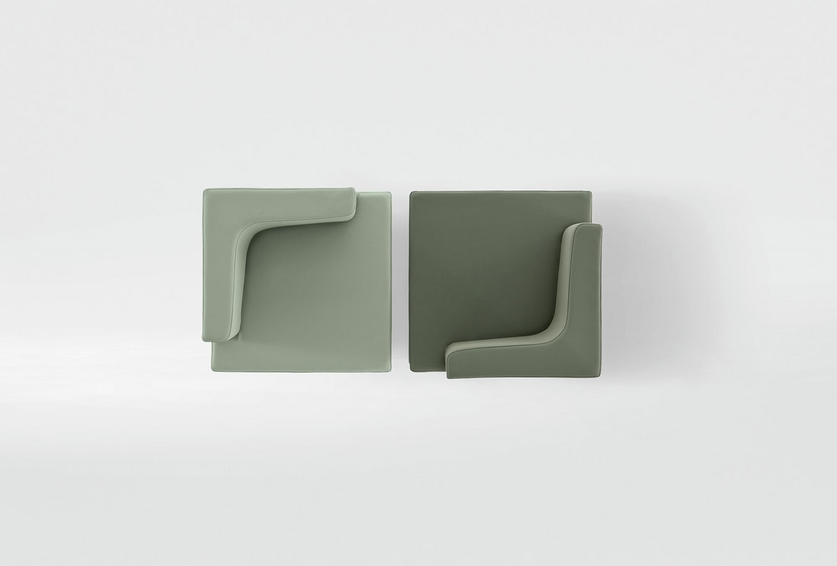 Fauteuil idéal pour salles d’attende et de conversation, interchangeable, disponible avec revêtement mono-couleur or bi-couleur.