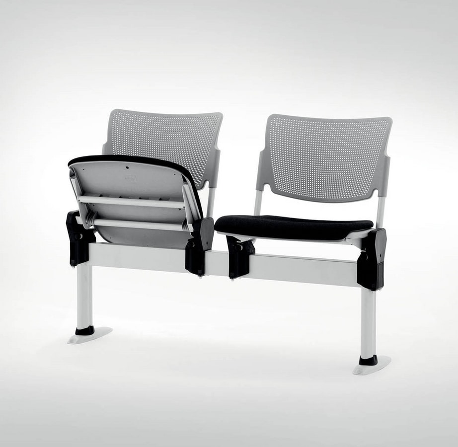 Banc pour salles d'attente avec pieds en métal et le dos en plastique perforé. Avec siège rembourré pliable. Disponible en différentes couleurs. Fabriqué en Italie.