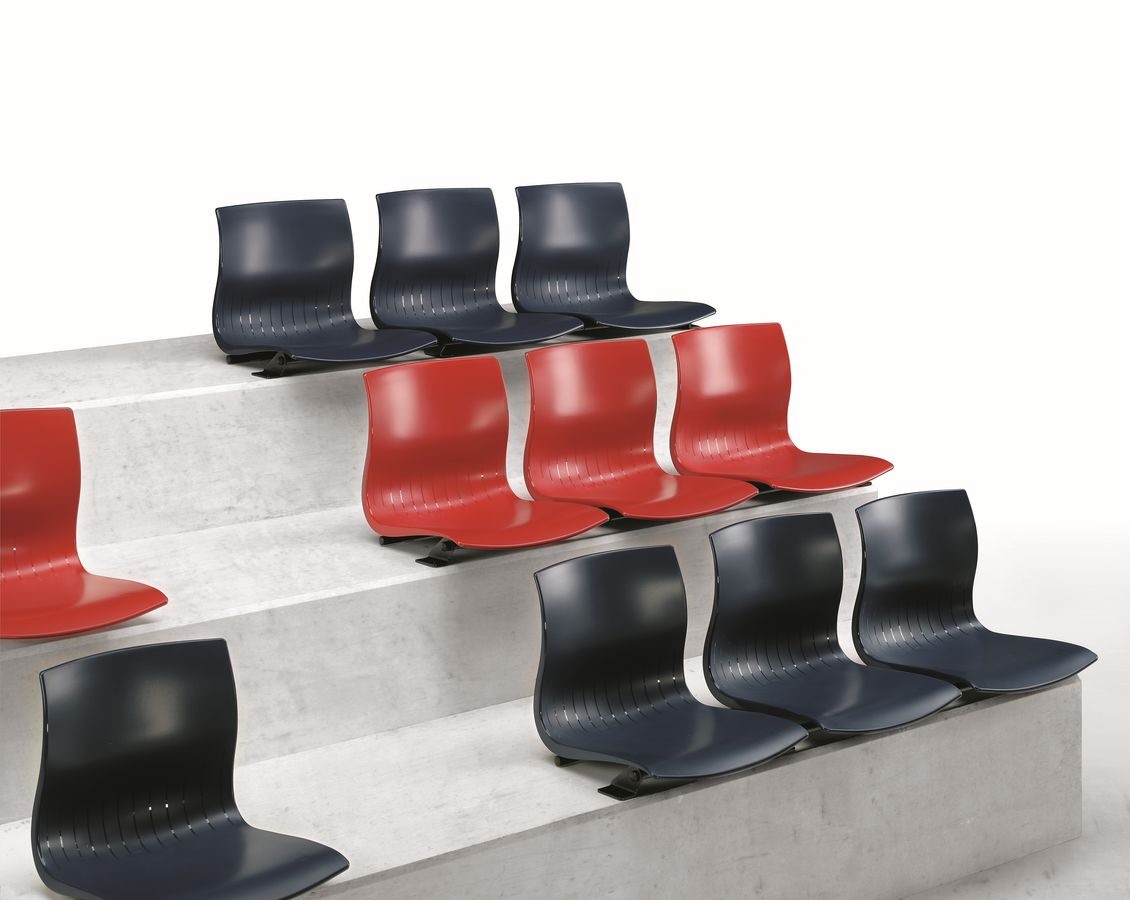 Chaise predisposez pour fixation au marche/terrasse avec coque en nylon disponible en plusieurs coloris. Système modulaire avec 1 ou plusieurs places.