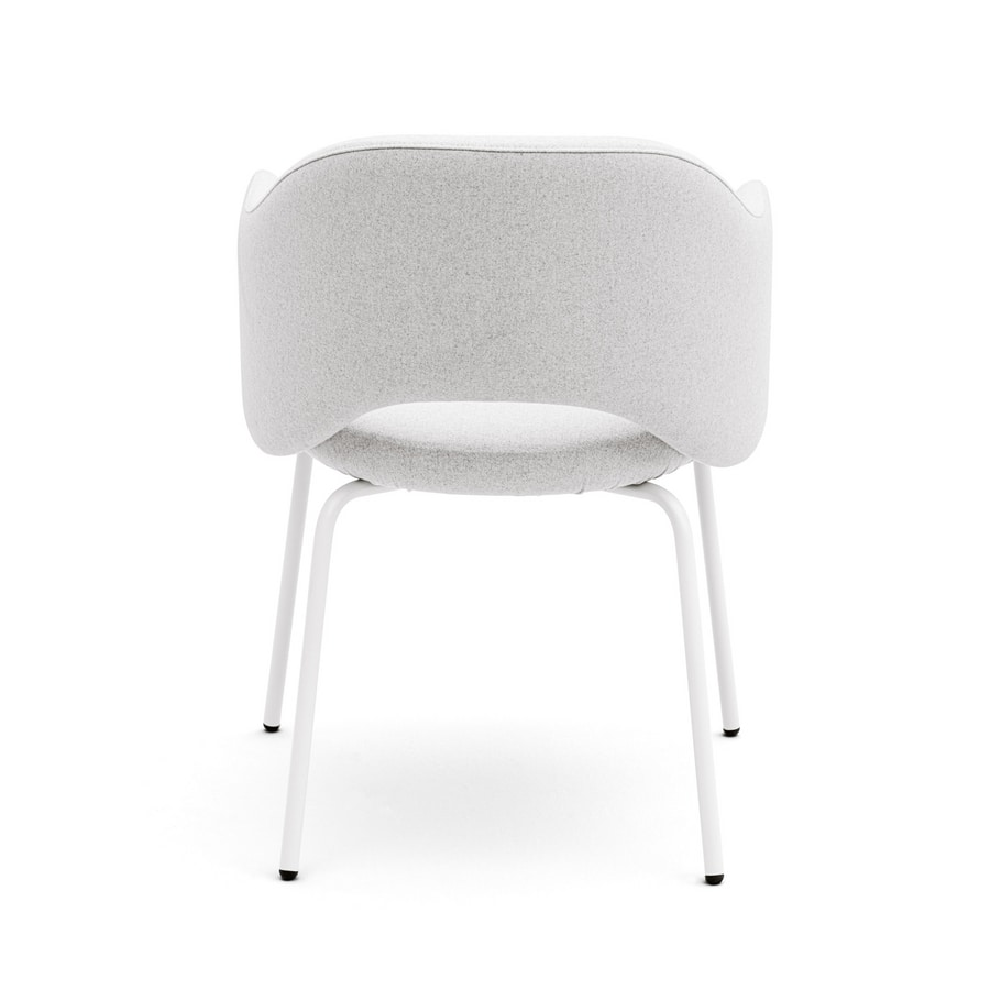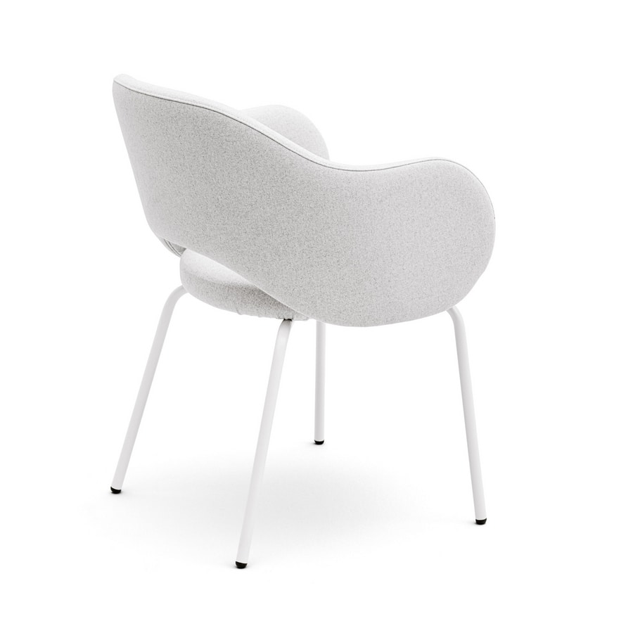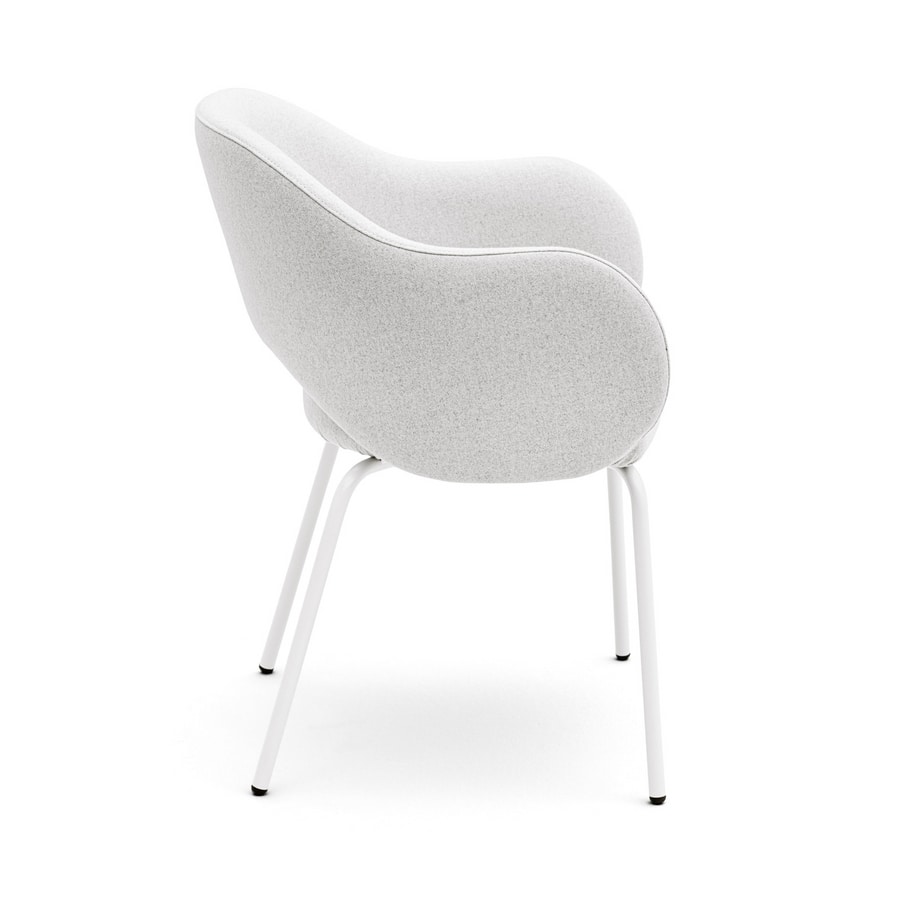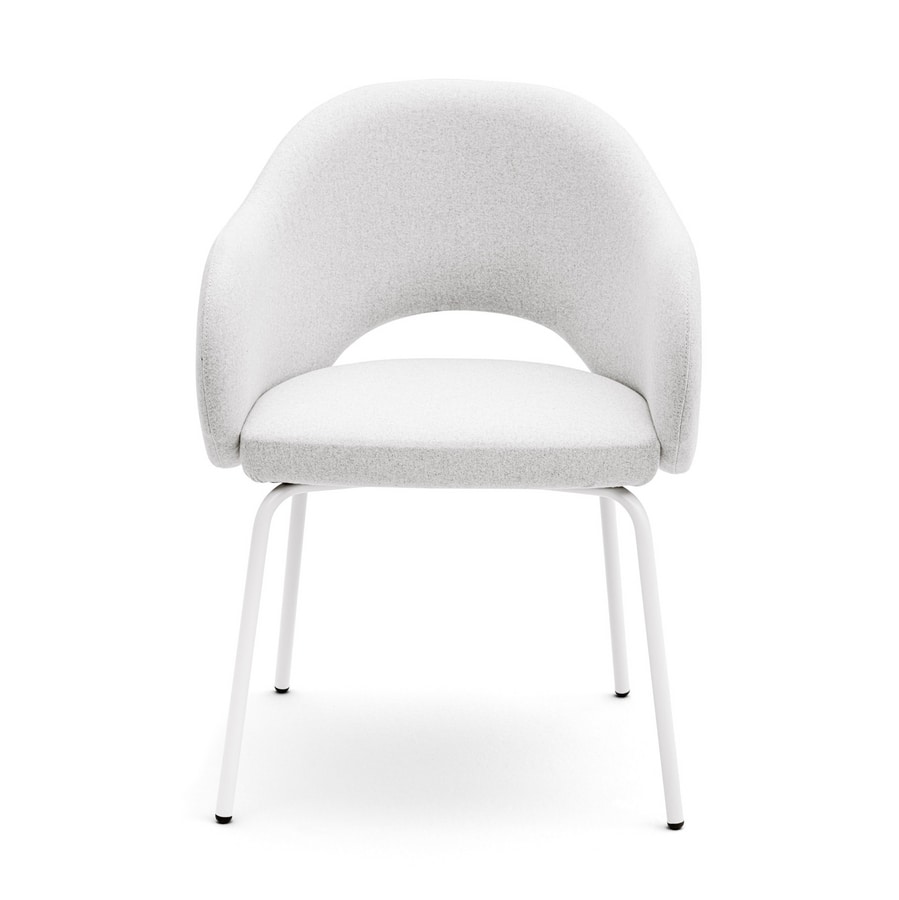 Fauteuil avec ouverture entre le dossier et l'assise. Coque en bois multiplies rembourré. Assise avec sangles élastiques pour un confort optimal. Pieds en métal laqué.