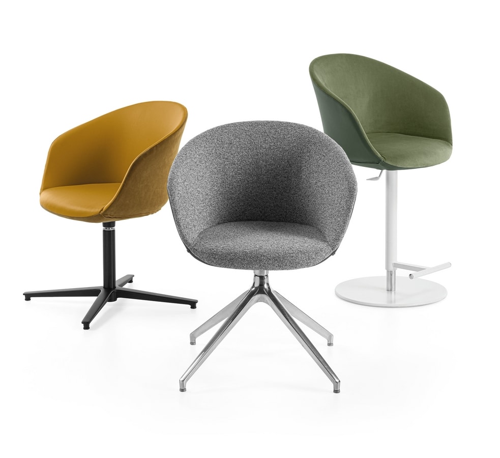 Série au contenu “total green”, conçue pour être entièrement démontable à la fin de la vie du produit. Chaque élément (corps et structures) a été sélectionné pour avoir une valeur “verte” intrinsèque. Les structures fixes et piètements pivotants sont: 4 pieds en hêtre massif associés à une structure métallique (éléments amovibles), 4 pieds en acier, piètement patin en tige en acier Ø 11 mm, base araignée en aluminium en version pivotante et élévatrice ou version pivotante non relevable, base en aluminium cruciforme 4 branches ou 5 branches équipée de roulettes ou de pieds, et enfin une base plate ronde en acier inoxydable pour chaise et tabouret, tous disponibles en plusieurs finitions.