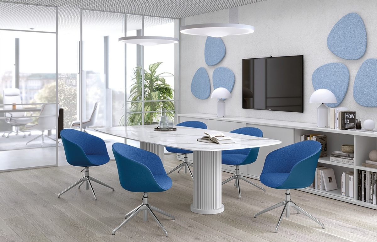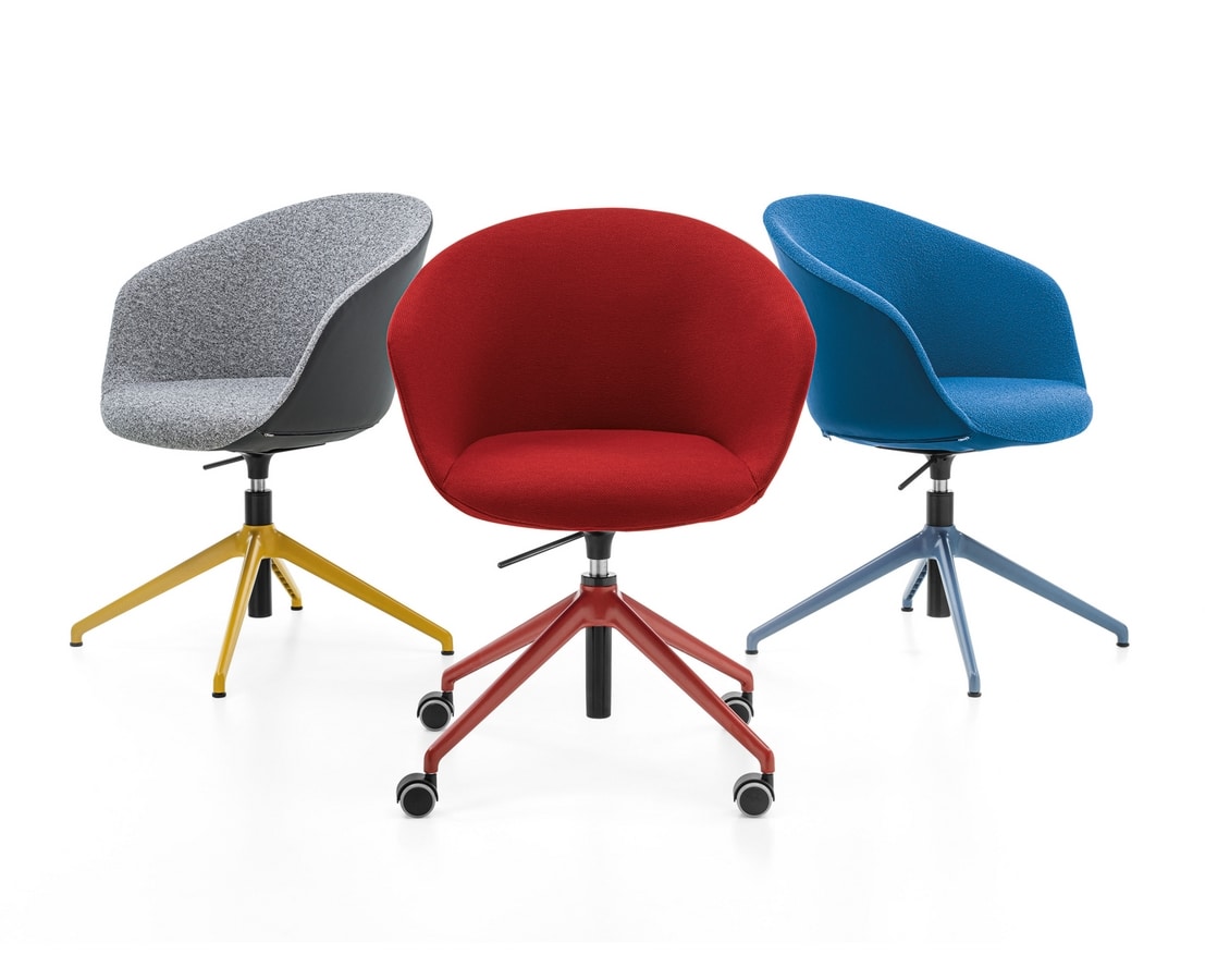 Série au contenu “total green”, conçue pour être entièrement démontable à la fin de la vie du produit. Chaque élément (corps et structures) a été sélectionné pour avoir une valeur “verte” intrinsèque. Les structures fixes et piètements pivotants sont: 4 pieds en hêtre massif associés à une structure métallique (éléments amovibles), 4 pieds en acier, piètement patin en tige en acier Ø 11 mm, base araignée en aluminium en version pivotante et élévatrice ou version pivotante non relevable, base en aluminium cruciforme 4 branches ou 5 branches équipée de roulettes ou de pieds, et enfin une base plate ronde en acier inoxydable pour chaise et tabouret, tous disponibles en plusieurs finitions.