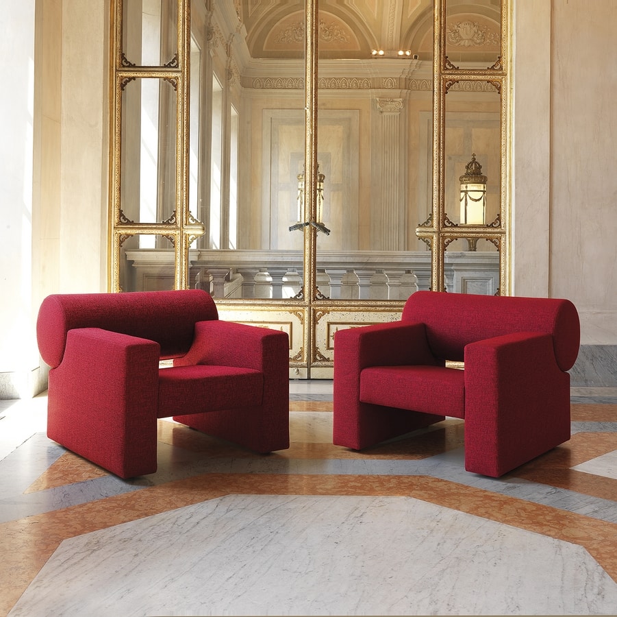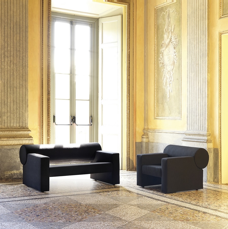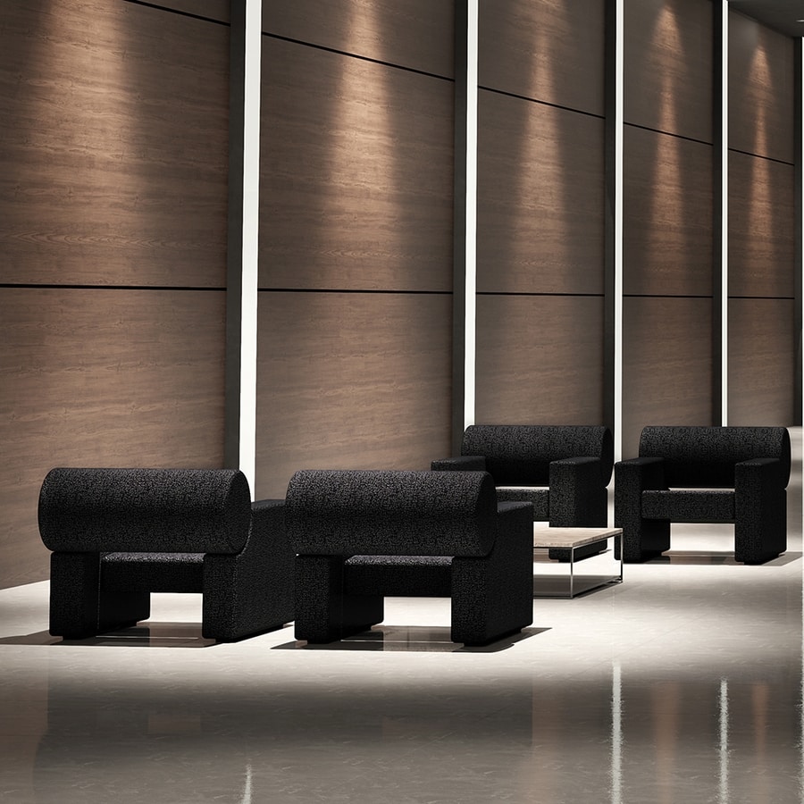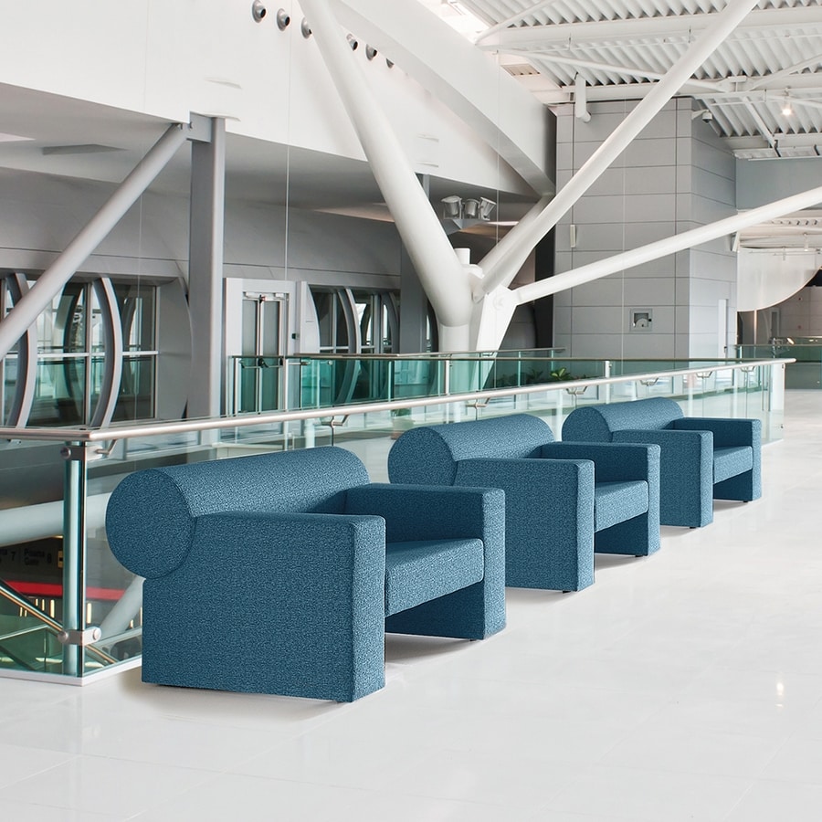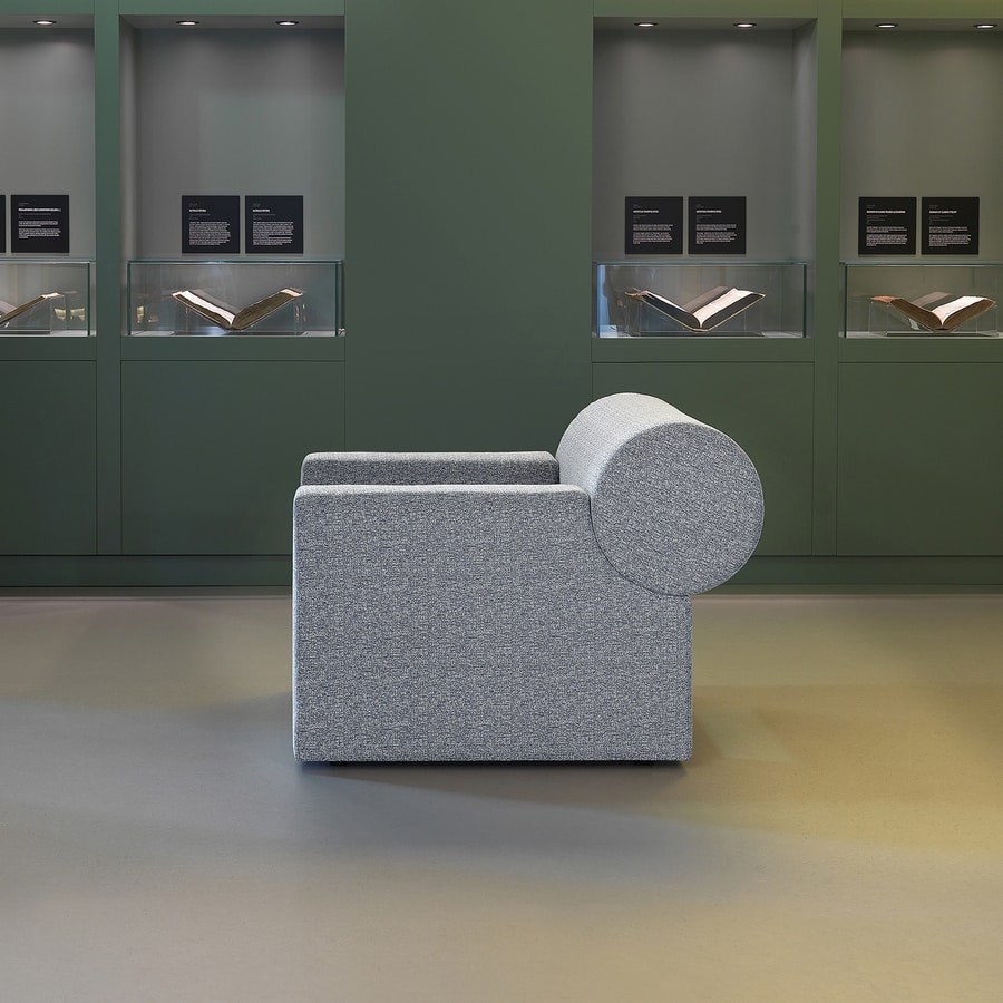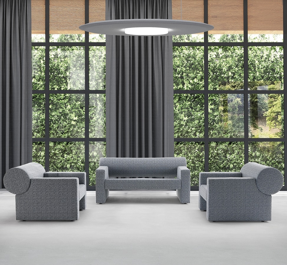 Fauteuil insonorisant avec structure en matériau bois, rembourrage intérieur en technopolymère insonorisant et revêtement extérieur en tissu.