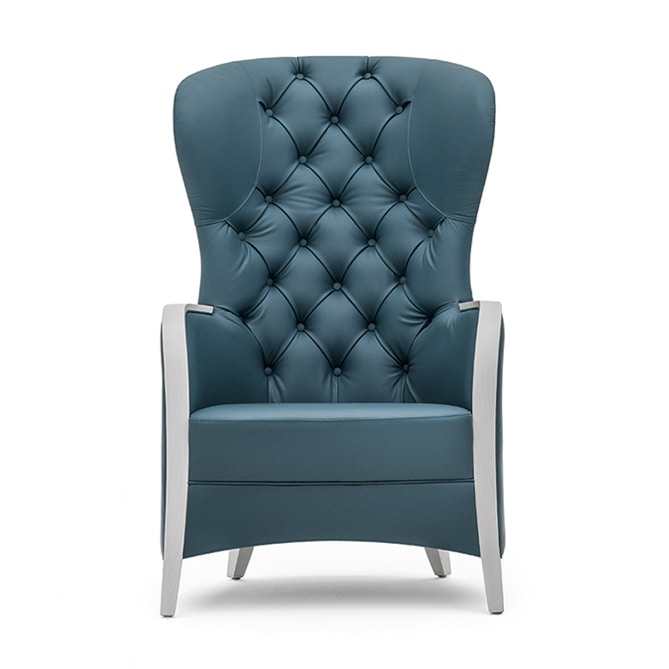 Bergère, structure en bois massif. Assise et dossier rembourrés. Avant du dos avec rembourrage en capitonné. Sans boutons de finition sur le dos extérieur.