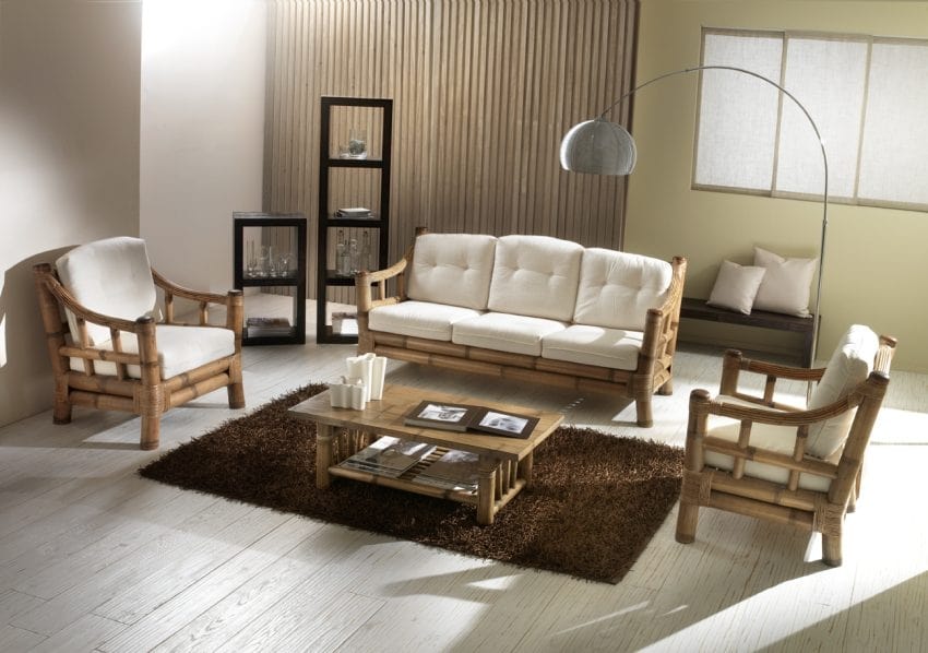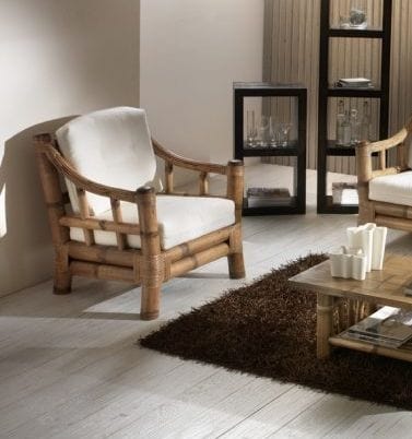 Fauteuil ethnique en bambou avec coussins amovibles.