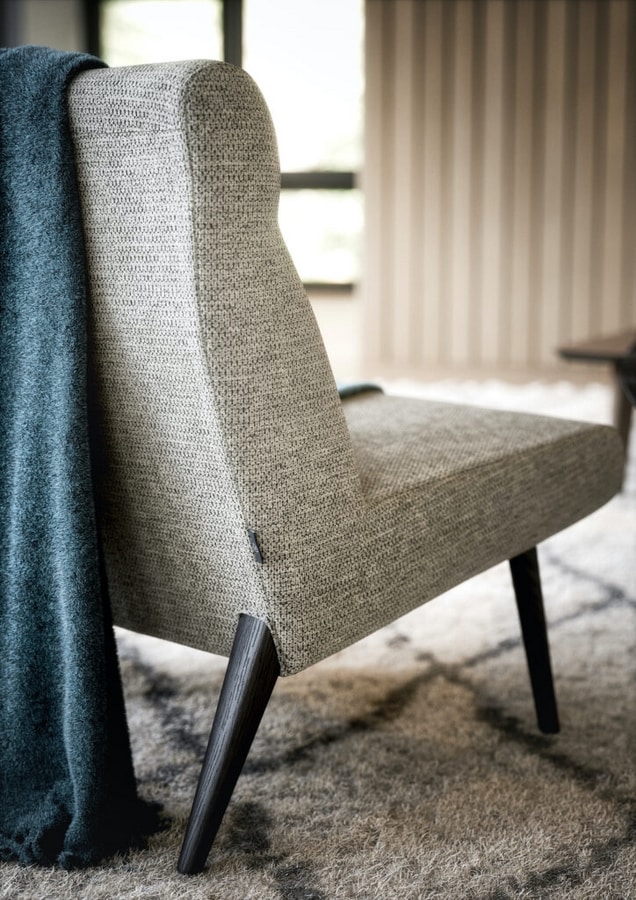 Fauteuil avec structure en bois, assise avec sangles, dossierlégèrement incliné muni de support lombaire, rembourrage en expansé et pieds en bois.