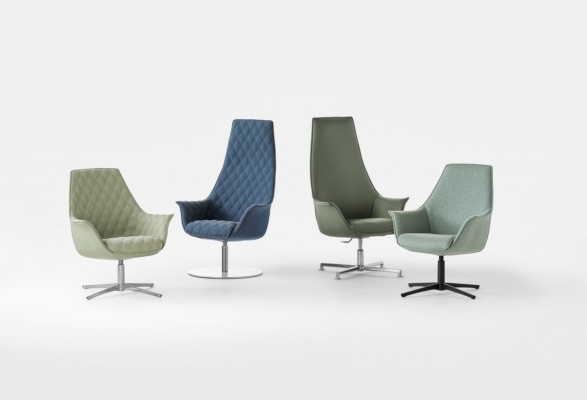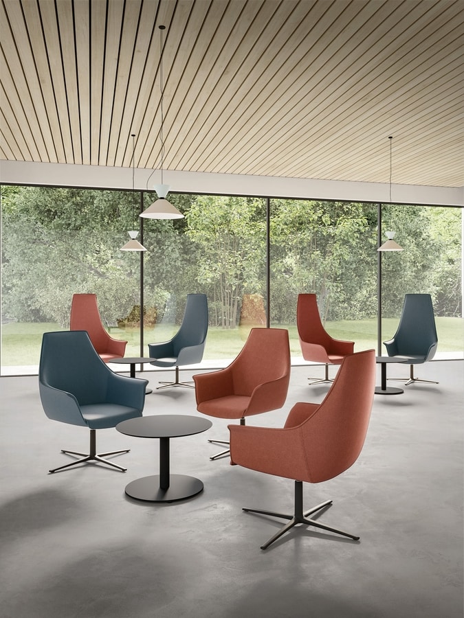 En attendant, détendez-vous et zones de conversation fauteuils avec différents piétements fixes ou pivotantes.