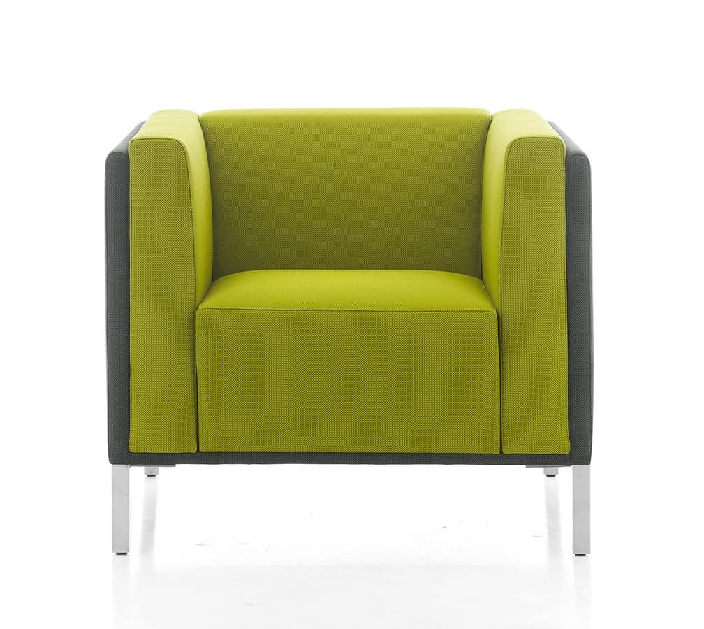 Fauteuil pour salles de réunion ou d’attente, avec bas dossier et revêtements unicolore ou deux couleurs sur pieds en acier verni blanc, noir ou chromé.