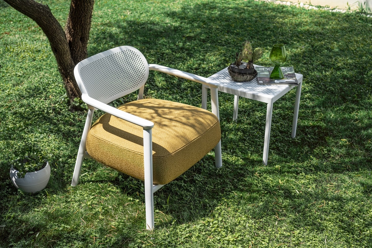 Le fauteuil Nuta Lounge, avec sa structure perforée en technopolymère et ses formes harmonieuses, complète la collection Nuta en apportant un confort accru grâce à son assise spacieuse. Parfait comme fauteuil lounge ou siège d’attente, il se distingue par son esthétique unique et son design soigné. Le coussin, profond et extrêmement confortable, est disponible en plusieurs types de revêtements, garantissant une expérience de détente inégalée, aussi bien en intérieur qu’en extérieur. Les patins en caoutchouc thermoplastique haute résistance permettent de le déplacer sans laisser de traces ni faire de bruit, pour une fonctionnalité et une praticité optimales.