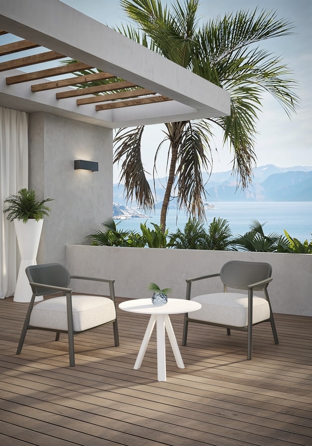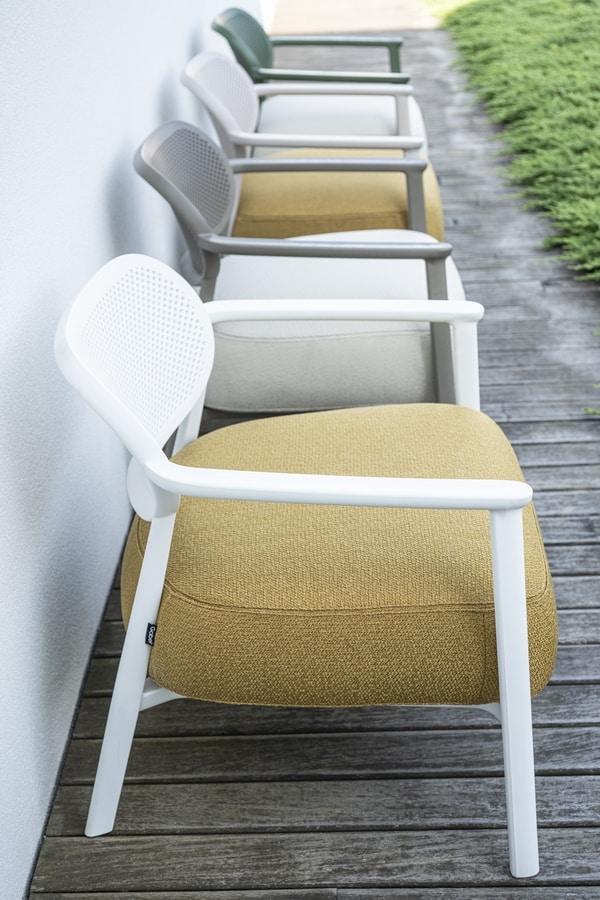 Fauteuil en technopolymère avec accoudoirs et coussin intégré
