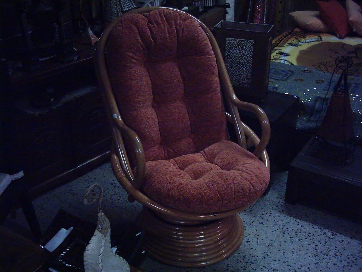 Fauteuil pivotant en rotin avec des rotules et des ressorts pour se balancer.