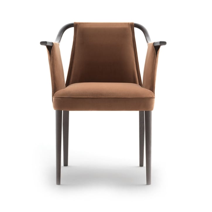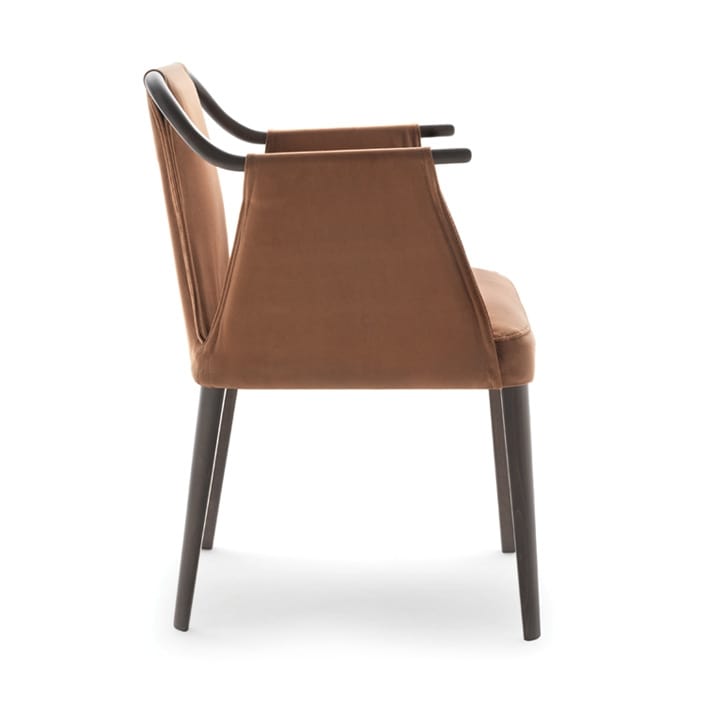 Bridge, structure en bois massif. Accoudoir courbé avec les chants arrondis. Les chants des pieds extérieurs sont tous arrondis. Assise, dossier et les accoudoirs entièrement rembourré sur la structure.