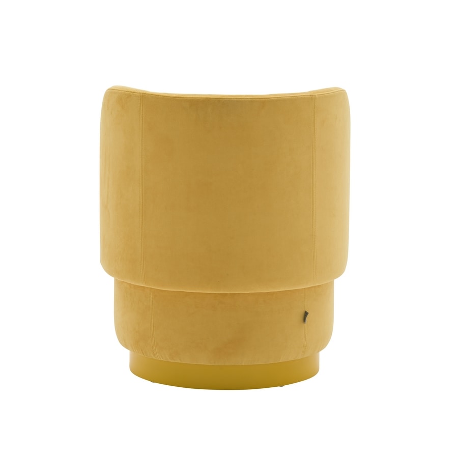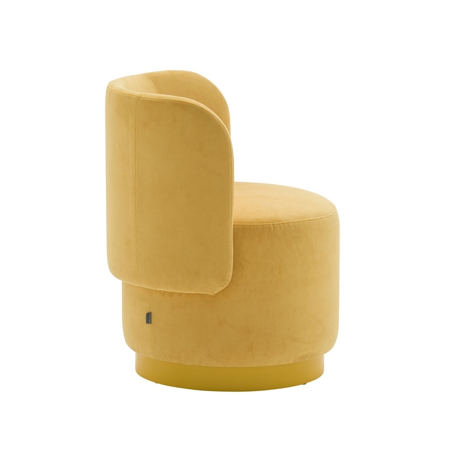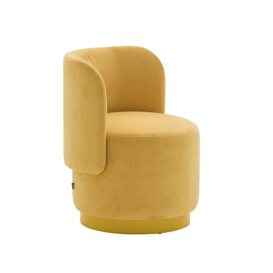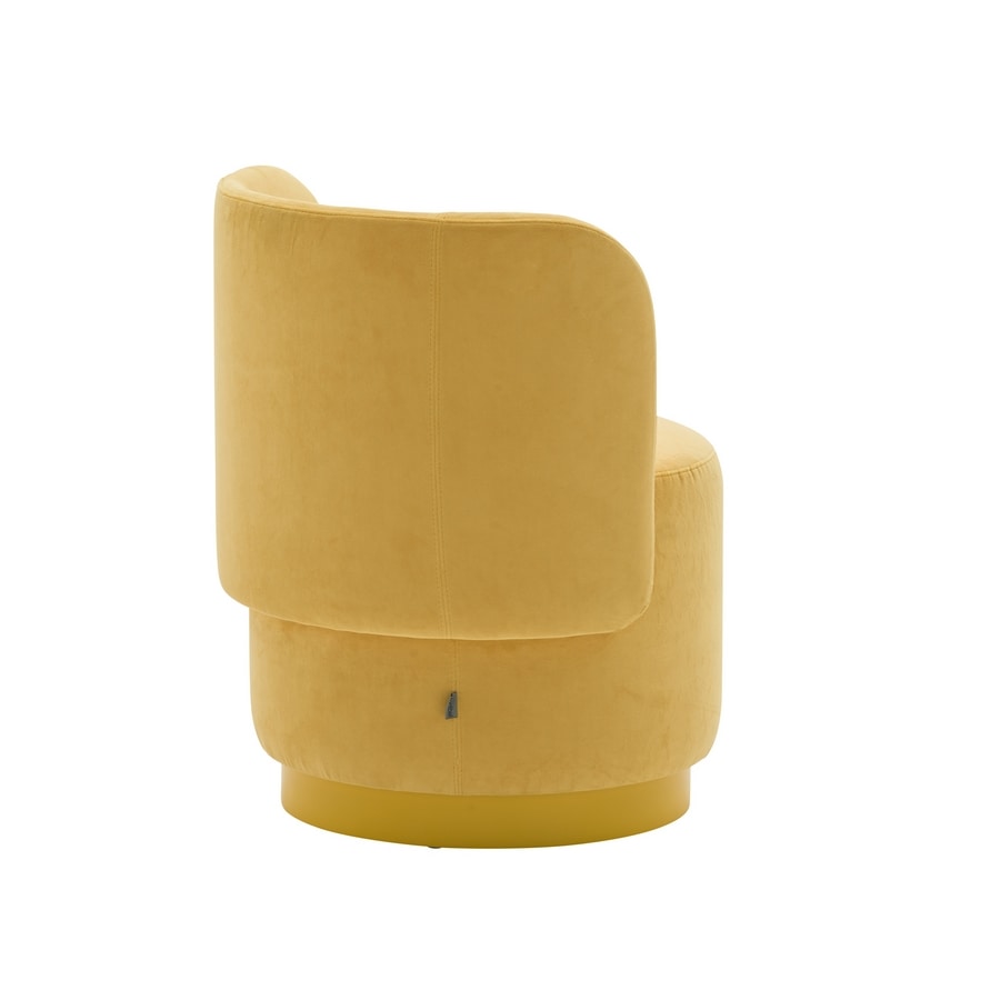 Fauteuil rond. Cadre en contreplaqué. Rembourré sur le cadre. Siège palmé. Plinthe en bois fini ou laqué.
