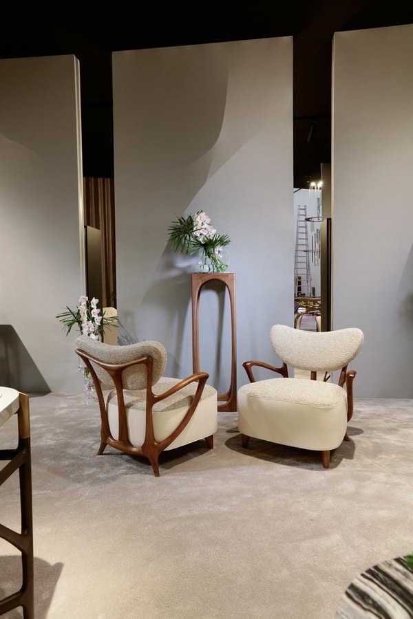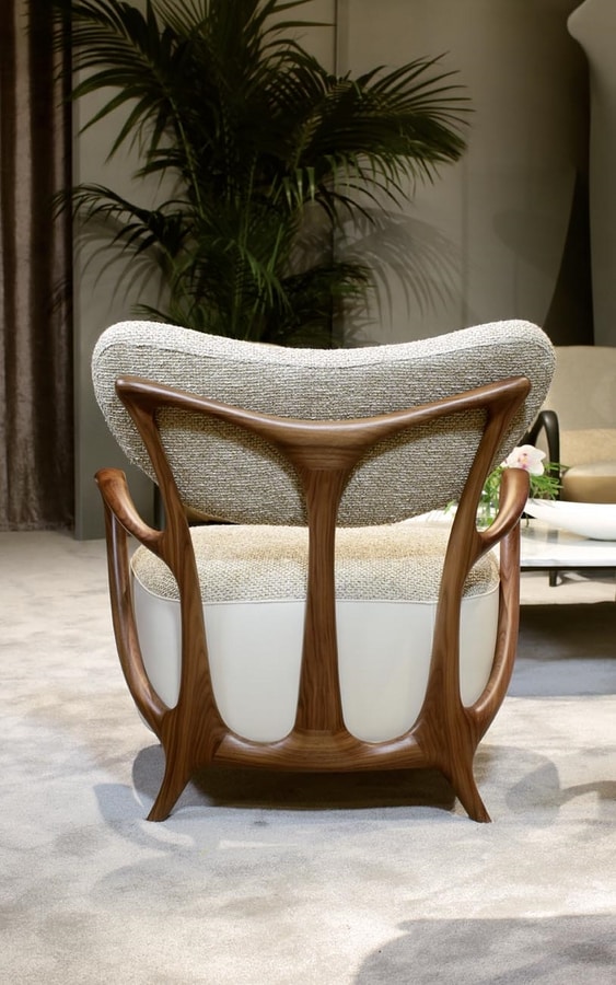 Fauteuil contemporain. La structure aux lignes nordiques est en noyer Canaletto massif, créant une forme particulière également sur le dossier. Le siège est rembourré à la fois en tissu sur le dessus et en cuir sur le côté. Disponible en différentes finitions telles que le frêne teinté gris et avec différents revêtements selon le goût de ceux qui doivent meubler leur maison. Idéal pour les salons, il se marie très bien avec les tables basses Teti, ou détendez-vous dans les coins avec des pots de plantes créant un mobilier design.