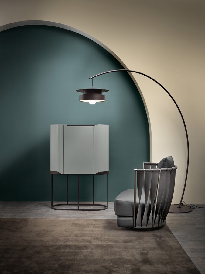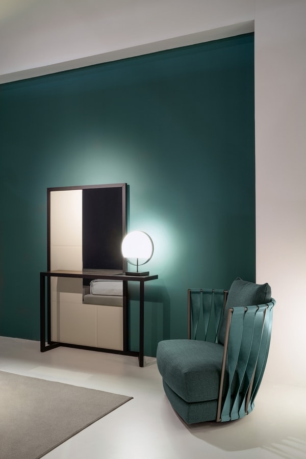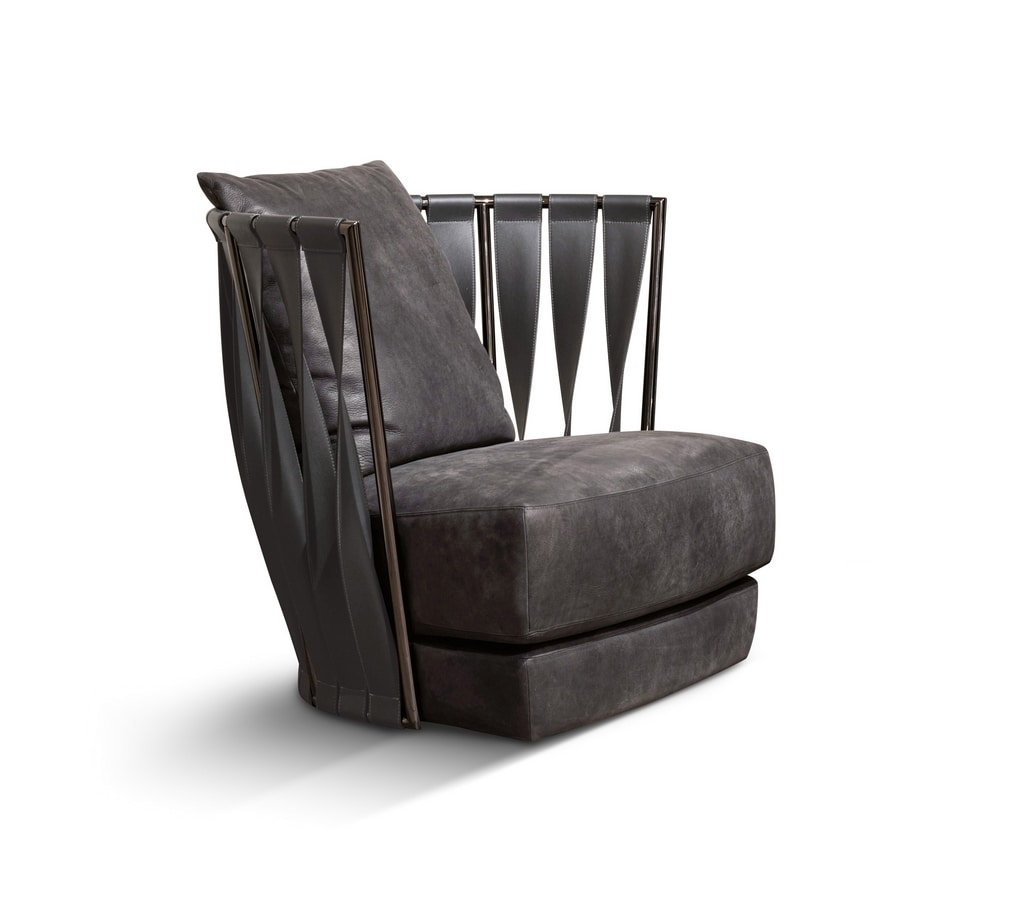Fauteuil en fer plié et mis en forme, alimentation en fil soudé, la main-frotté et poli à la main. Finition bain de galvanisation, l'épaisseur minimum de 25 microns. Assise en pantographe coupe multicouche de hêtre. Rembourrage en caoutchouc mousse avec une plume remplie de couche supérieure. Feather-remplie coussins décoratifs. La main sur mesure rembourrage. Ou en cuir nubuck bagué en arrière, la main scié avec points de suture visibles.