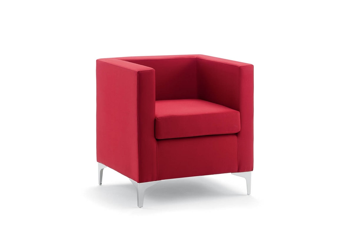 Fauteuil carré avec pieds en métal chromé. Disponible en différentes couleurs. Conçu dans un style minimaliste.