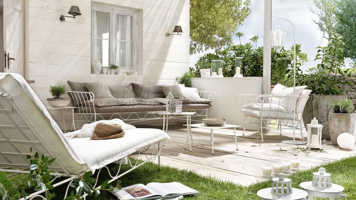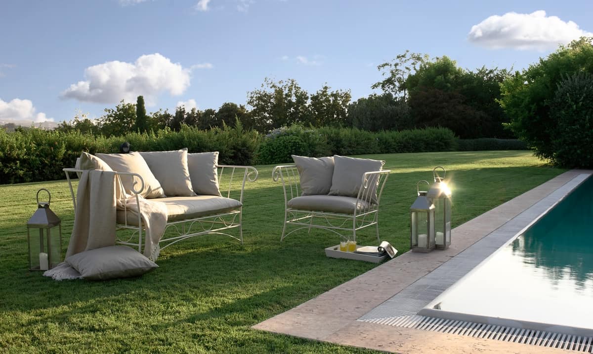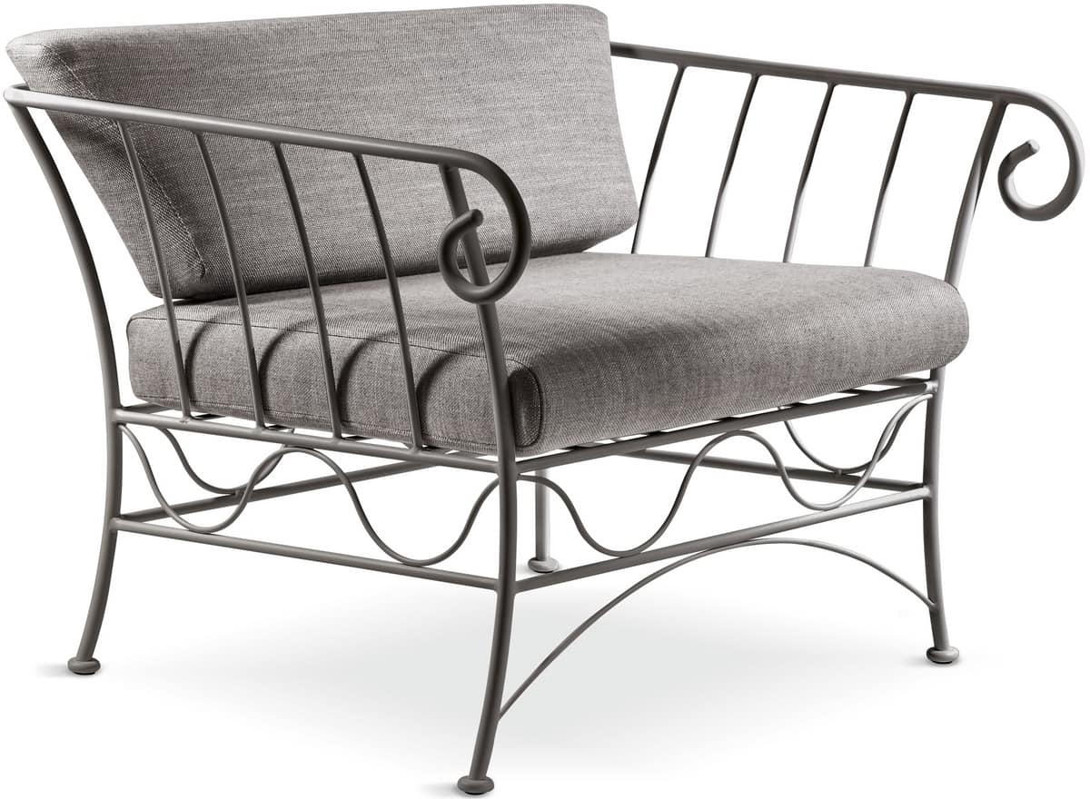 Fauteuil classique avec structure en métal et rembourrage en tissu. La structure est en fer anthracite, incurvé, conique et chaud, avec un fil de fer et un cirage à la main. Dans la version extérieure, le métal subit un traitement de tropicalisation. L'ensemble des coussins de siège et de dos sont complètement démontables.