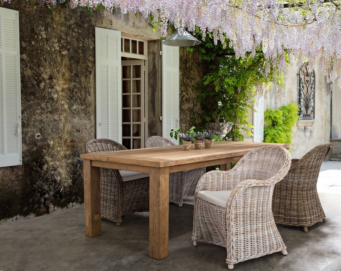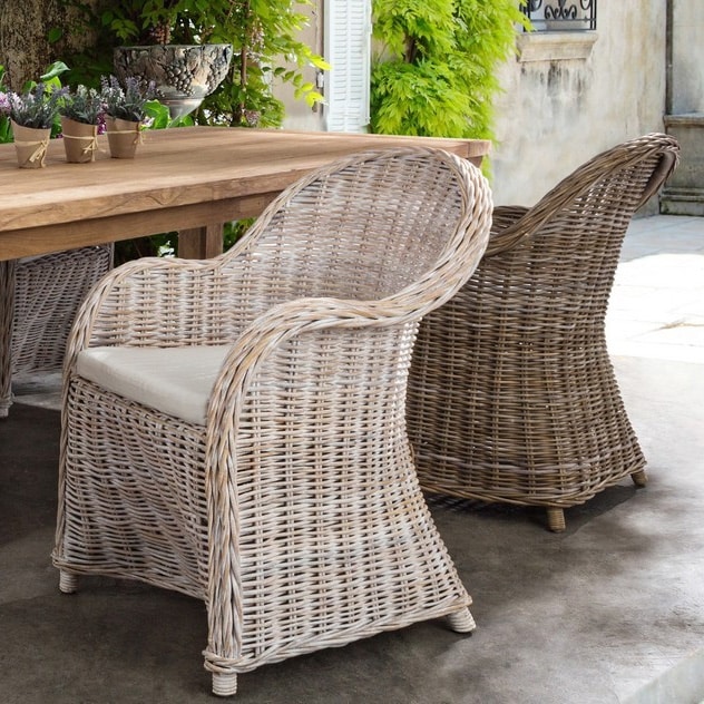 Fauteuil avec structure de rotin et tissé à Kubu. Finition à base de nitrocellulose. Coussin avec tissu en coton blanc, rembourrage amovible.