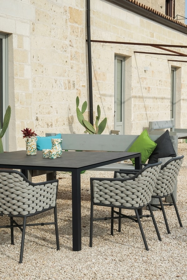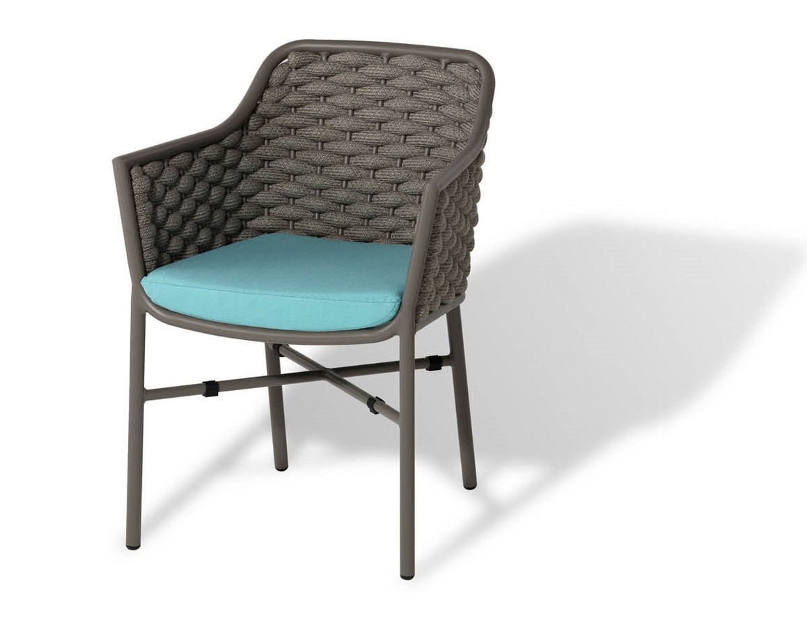 Fauteuil empilable en aluminium avec revêtement en textilène ou tissu en polyester et caoutchouc. Coussins en tissu acrylique.