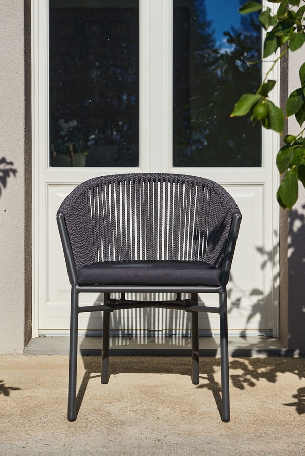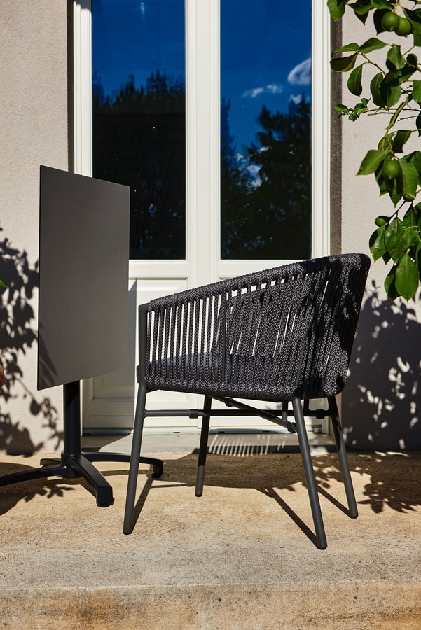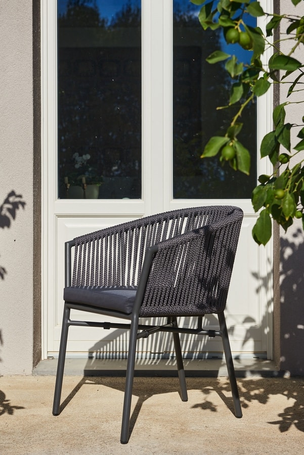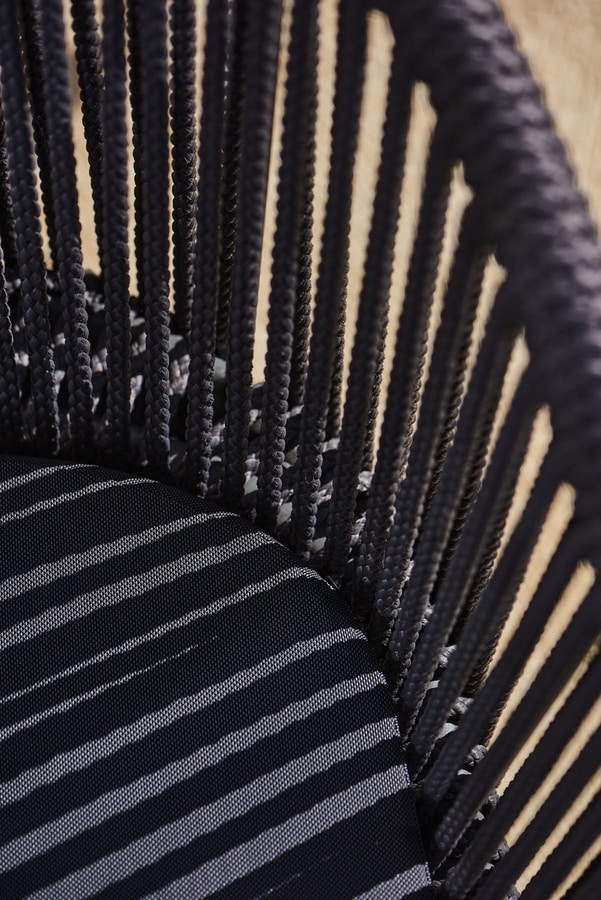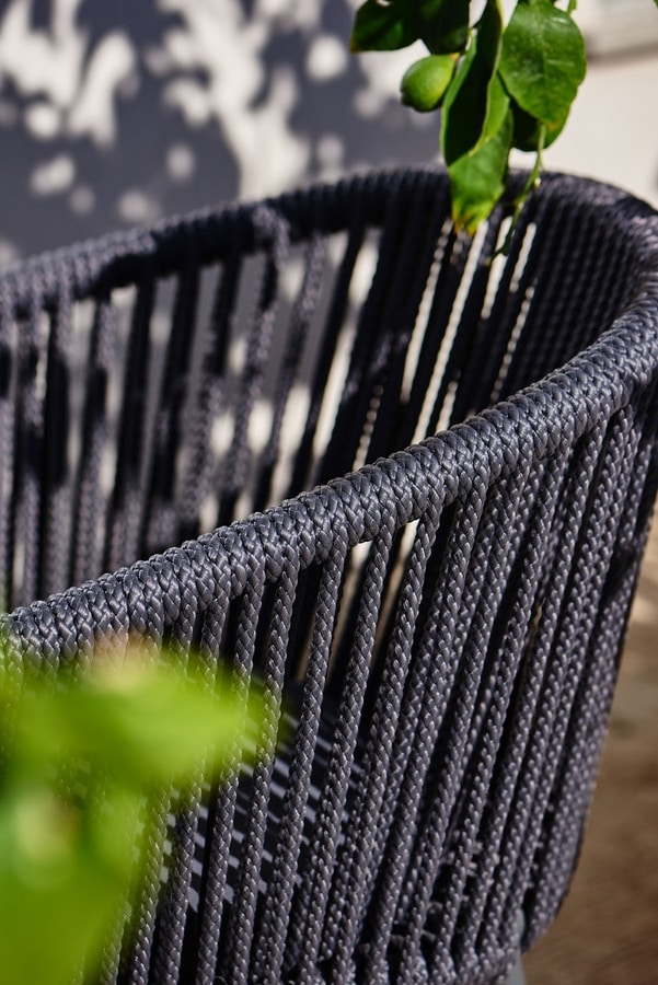 Une seule corde, comme dans une harpe, encercle ce siège au parfum informel. Un classique de l'extérieur revisité avec une attention particulière portée à un détail spécifique, ce qui en fait un meuble exprimant l'accueil et le confort.