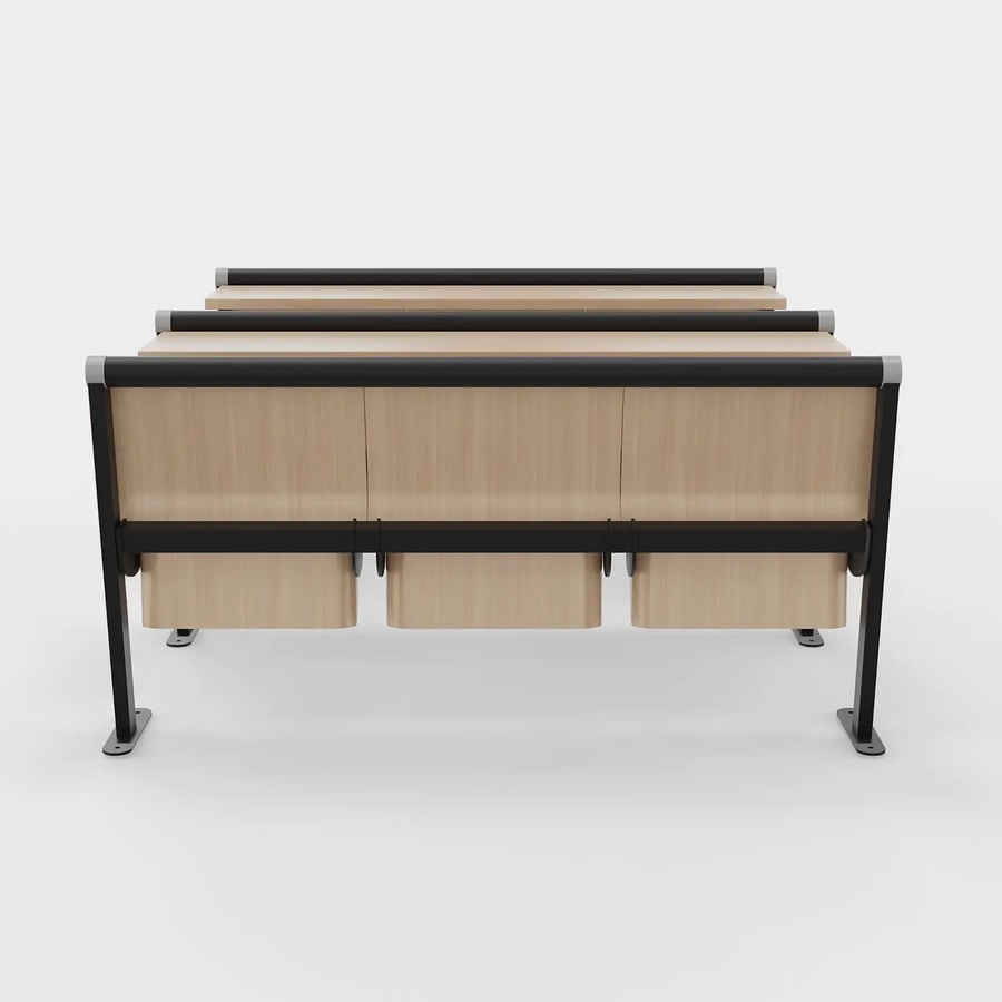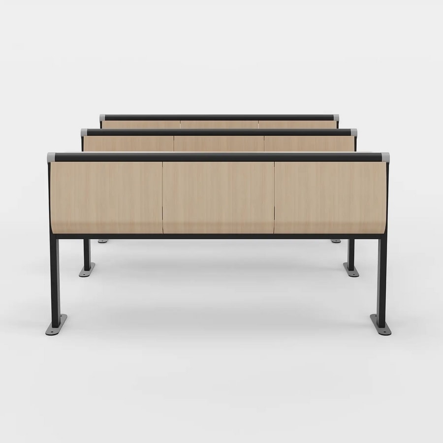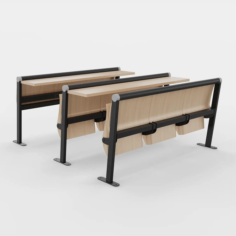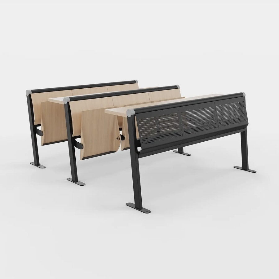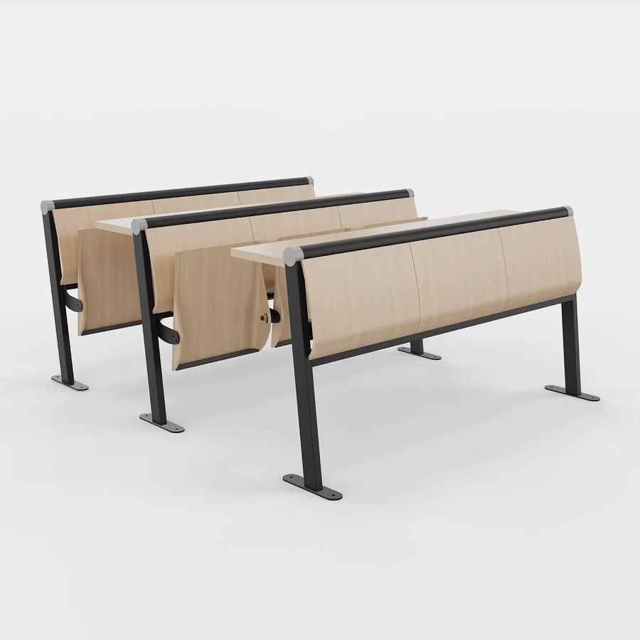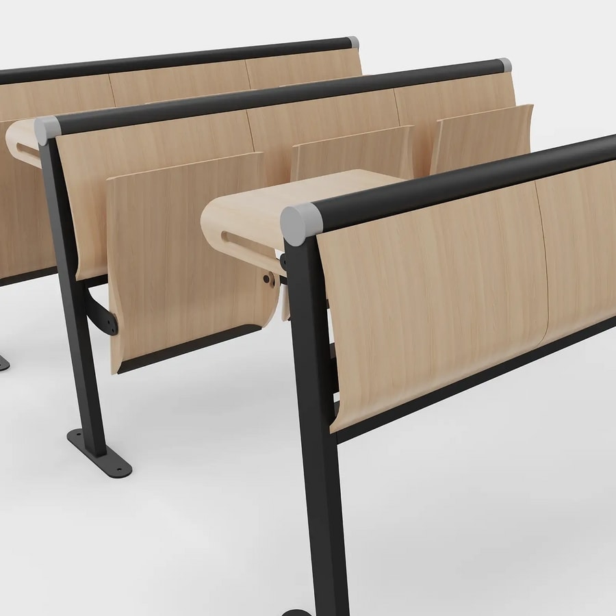 Grande adaptabilité à tous les environnements et à toutes les configurations demandées (lignes droites ou courbes, sols ou marches plats ou en pente). Versions en bois et rembourrées ; corniches d'écriture fixes ou rabattables.