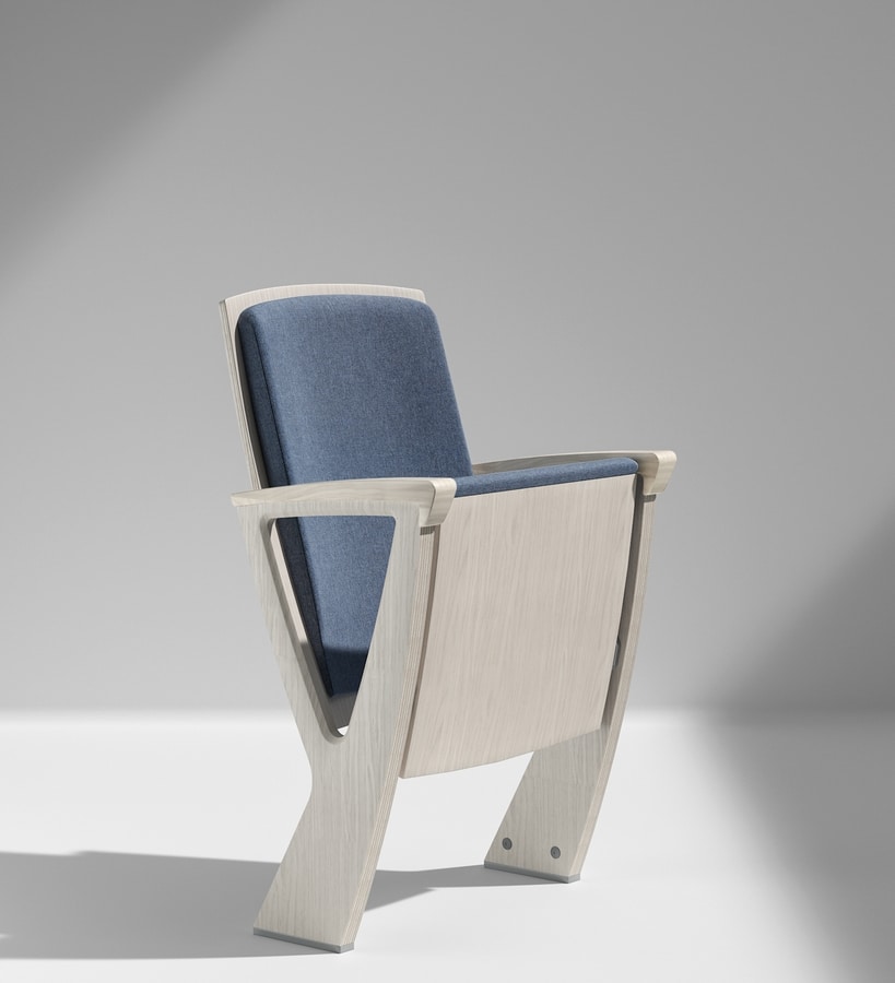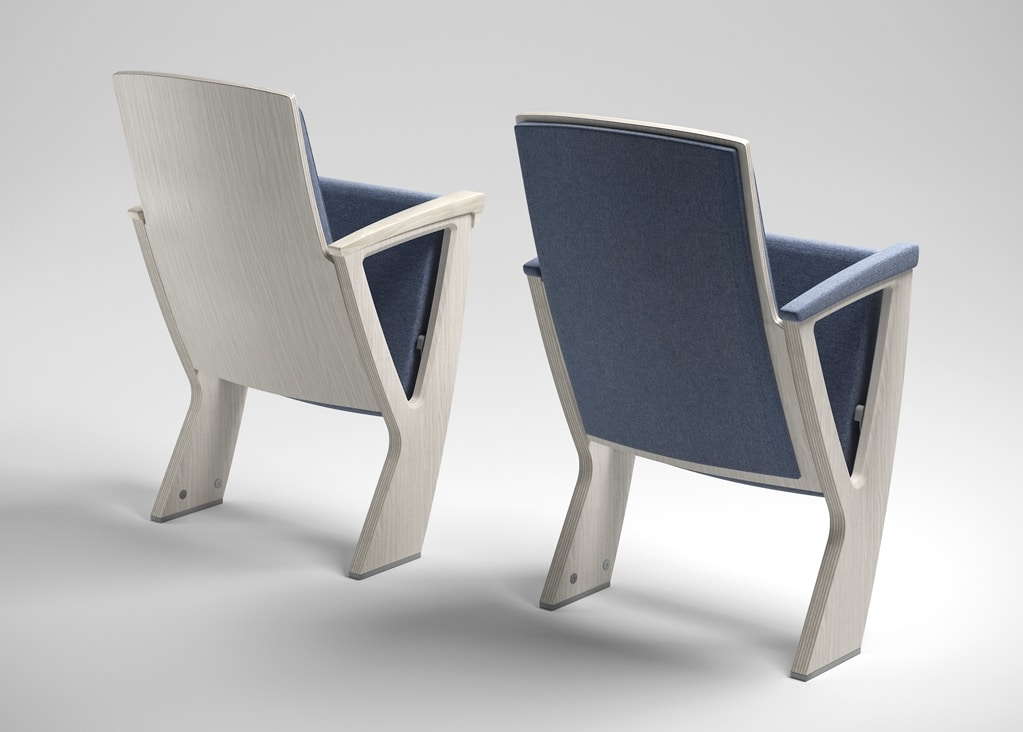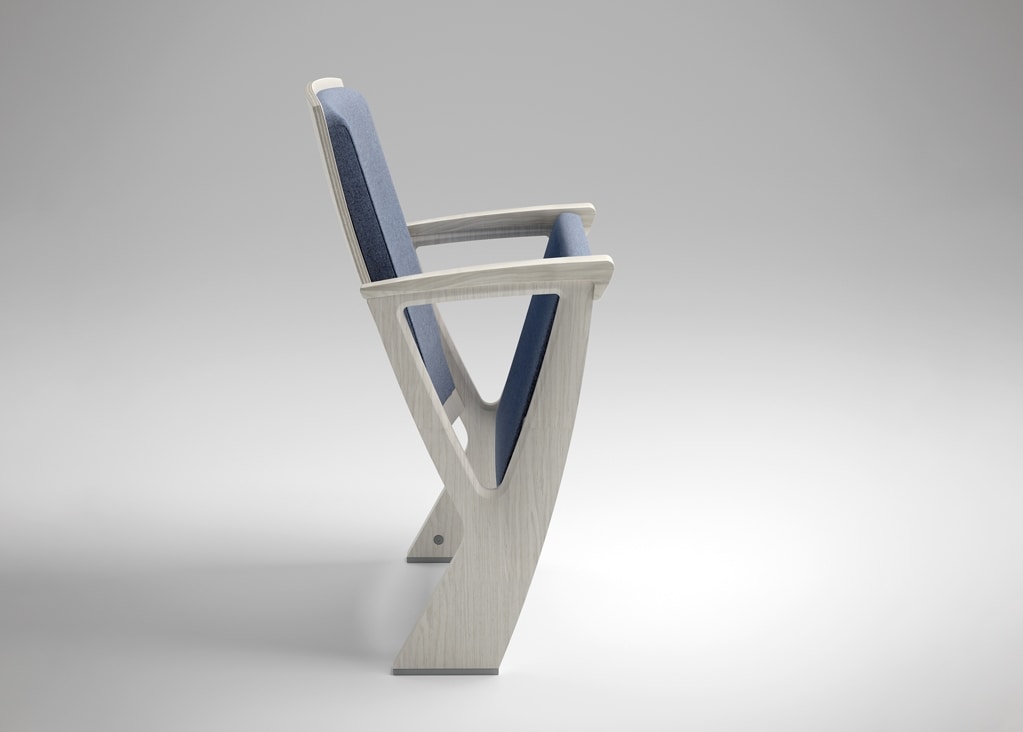Une chaise de théâtre, aux lignes essentielles et dont le côté rappelle la forme d'un diapason (diapason en italien) ou d'un "Y", a pour particularité d'être compacte. L'élégance et la compacité sont encore plus soulignées lorsque le siège basculant est complètement fermé et s'adapte parfaitement au côté sans faire de saillie, tout en maintenant sa forme élégante. Ses finitions permettent des combinaisons infinies, en expérimentant des finitions en bois raffinées et en recouvrant les meubles.