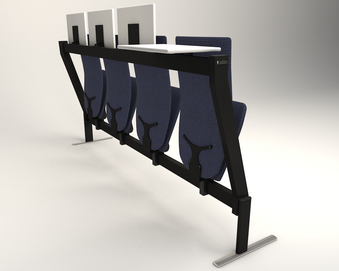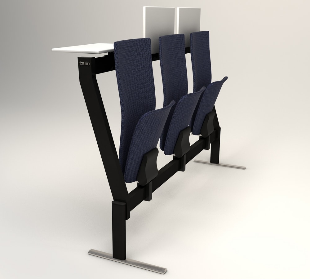 En option : Façade rembourrée pour siège, assise et dossier entièrement rembourrés (avant + arrière), assise + dossier chêne blanc ou bouleau ou wengé, kit de fixation au sol, hauteur d'adaptation personnalisée selon le projet, prise de courant le long de la colonne et sous le plateau, voile de fond en métal pour version droite ou courbe, voile de fond en bois pour version droite.