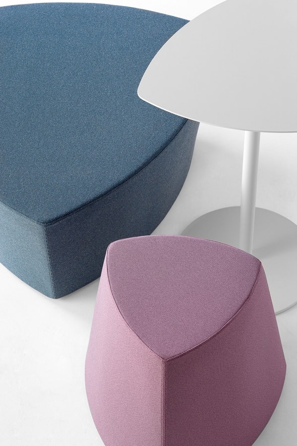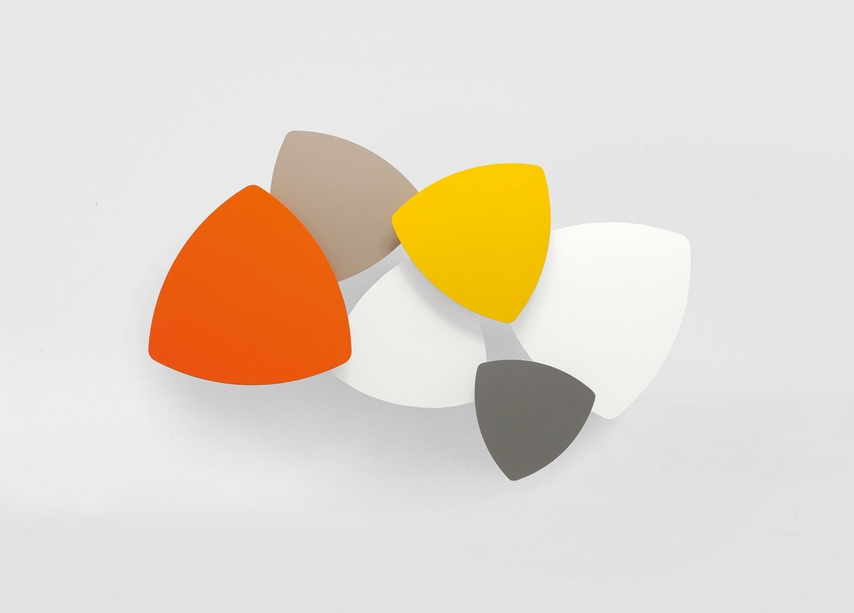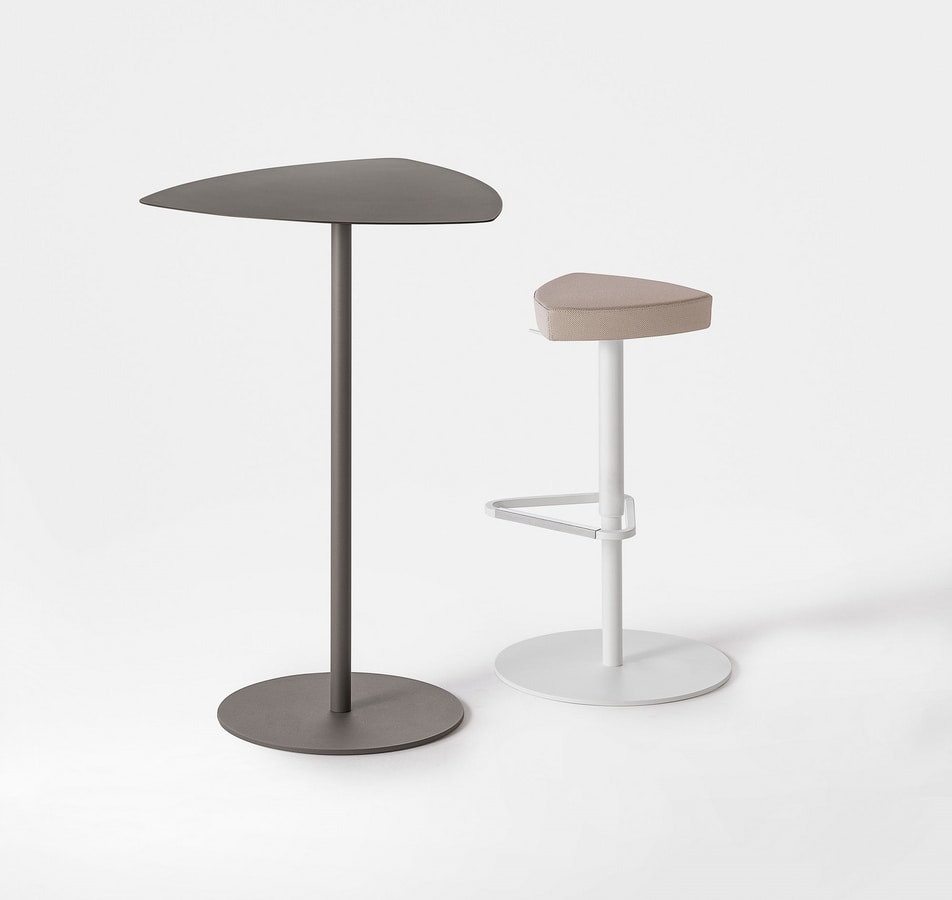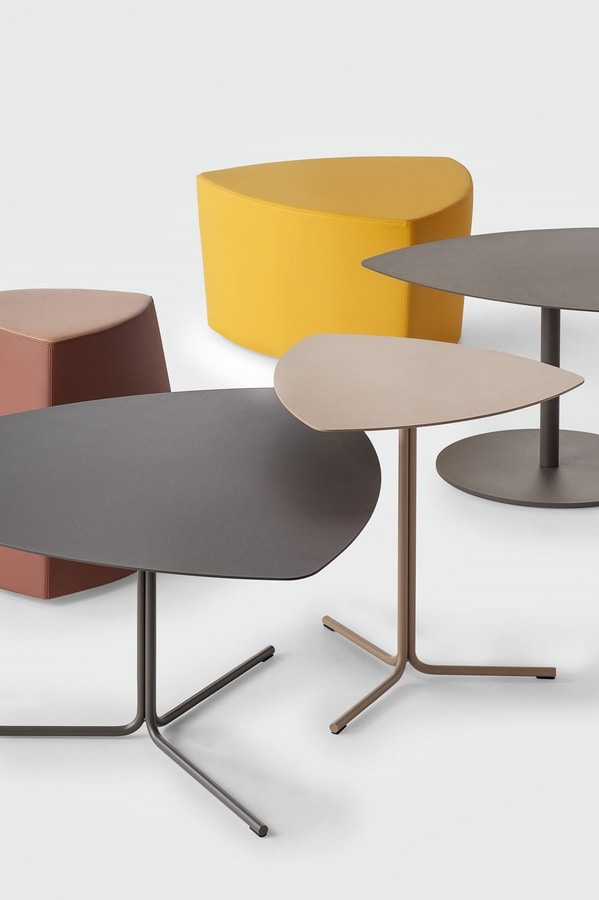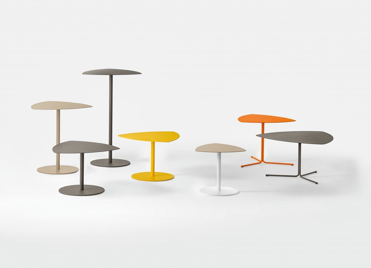 Gamme de tables en forme de triangle arrondi. Plateau en acier épaisseur 4 mm. verni: blanc, jaune, orange, tourterelle et lave. Piétement à 3-branches en toron d’acier verni: blanc, jaune, orange, tourterelle, lave. Piétement ronde à plat en acier verni: blanc, jaune, orange, tourterelle, lave ou chromé.