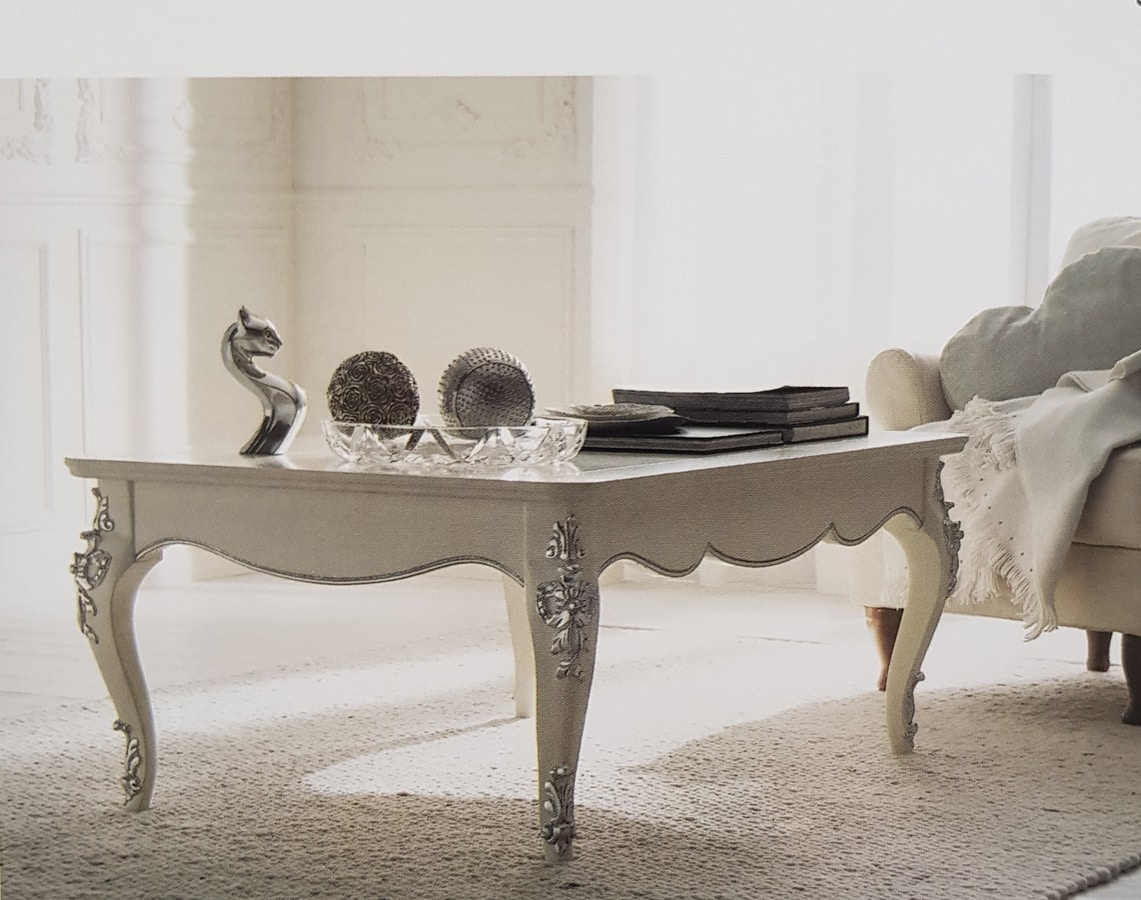 Table basse moulée avec des sculptures au fini laqué blanc et des détails en feuille d'argent.