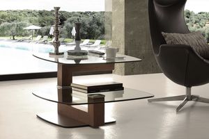 Table basse moderne en verre et noyer, avec dessus pivotant