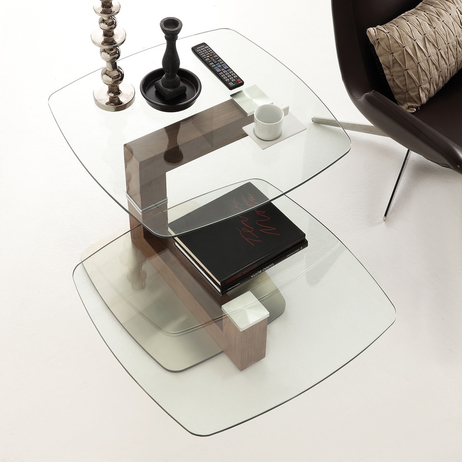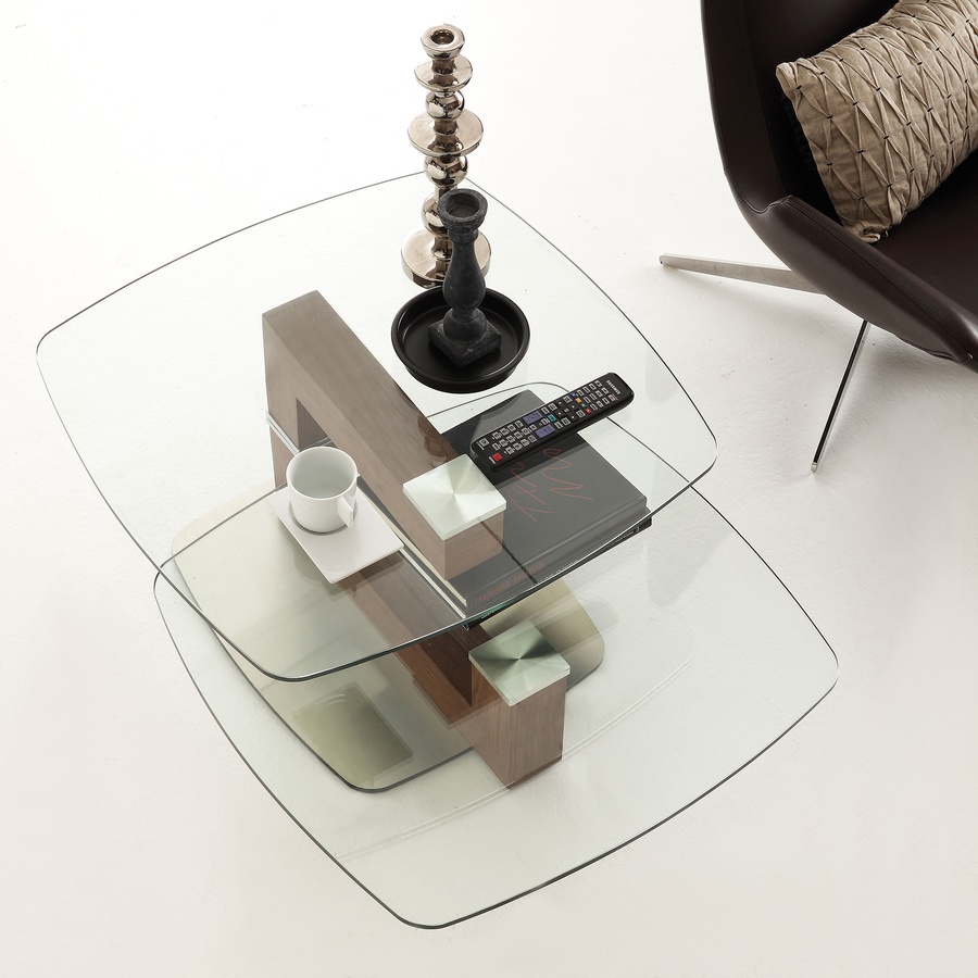 Table basse moderne en verre et noyer, avec dessus pivotant
