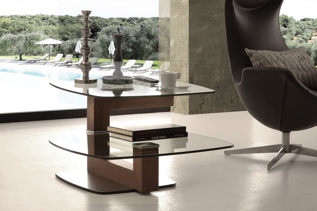 Table basse en verre pour salon et noyer américain.