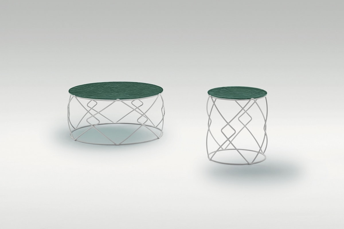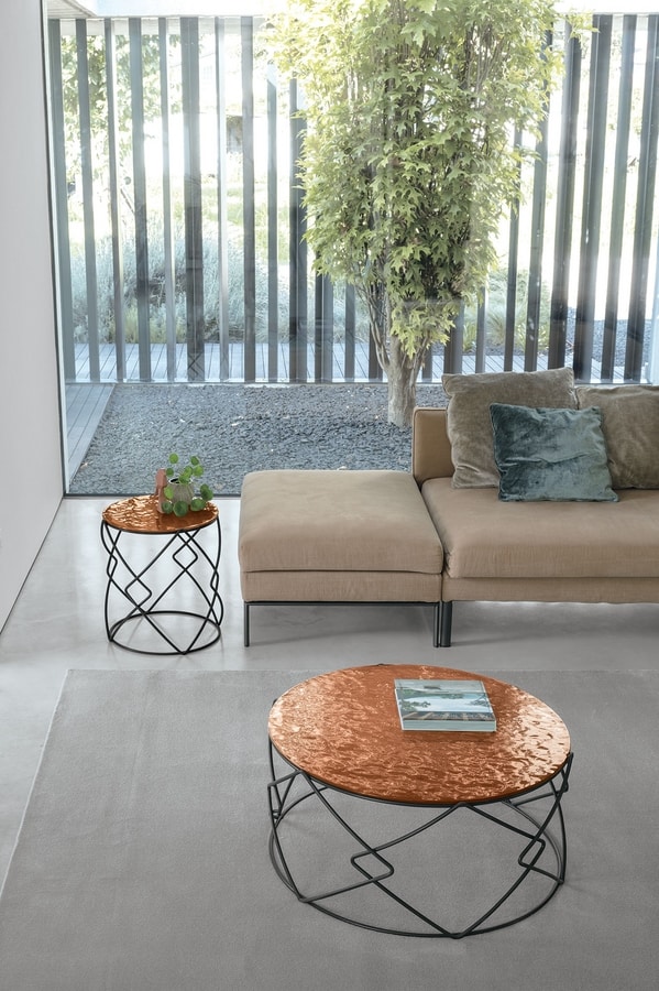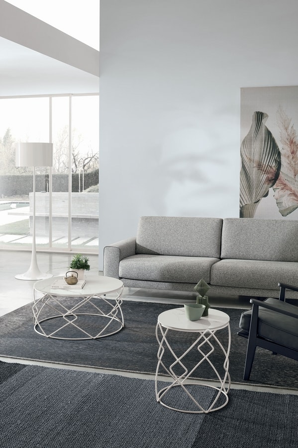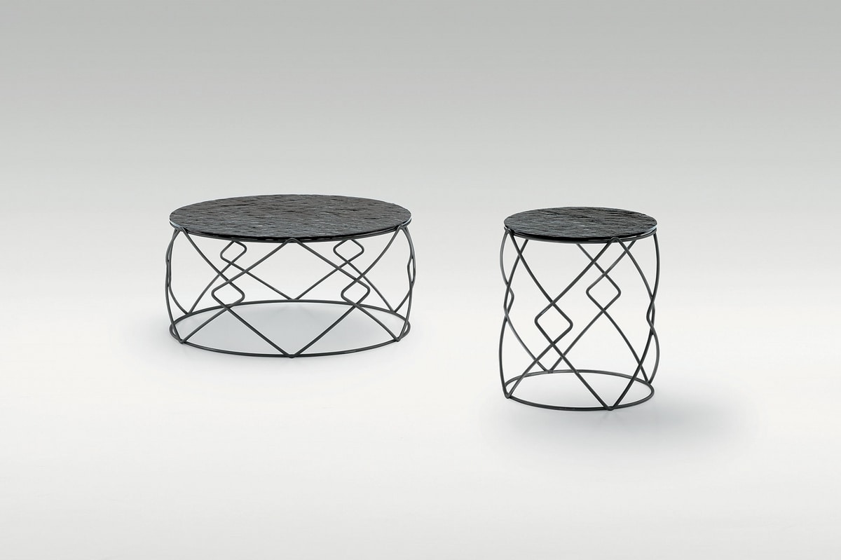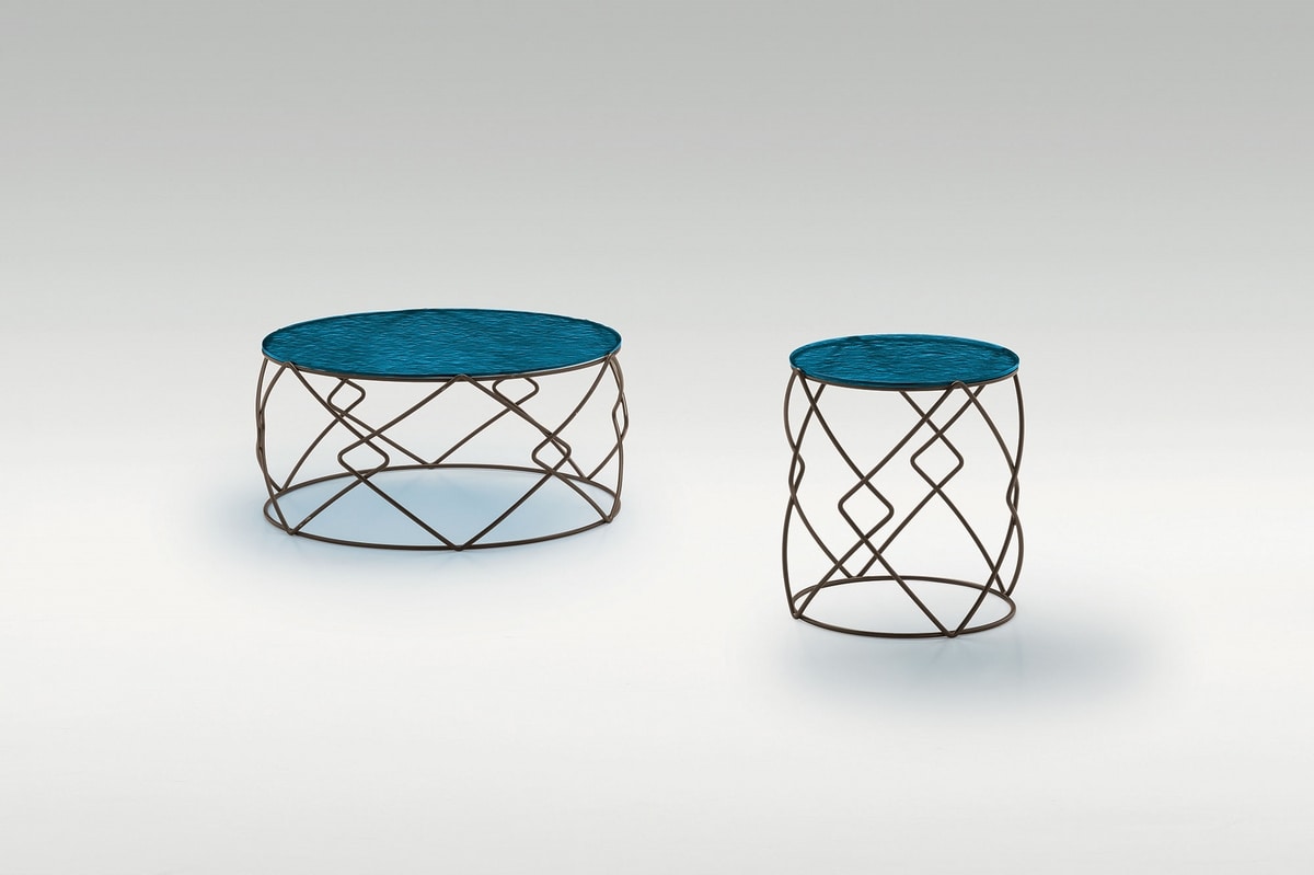 Table basse avec structure en fer laqué. Plateau en ceramique ou verre ondulé.