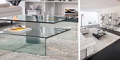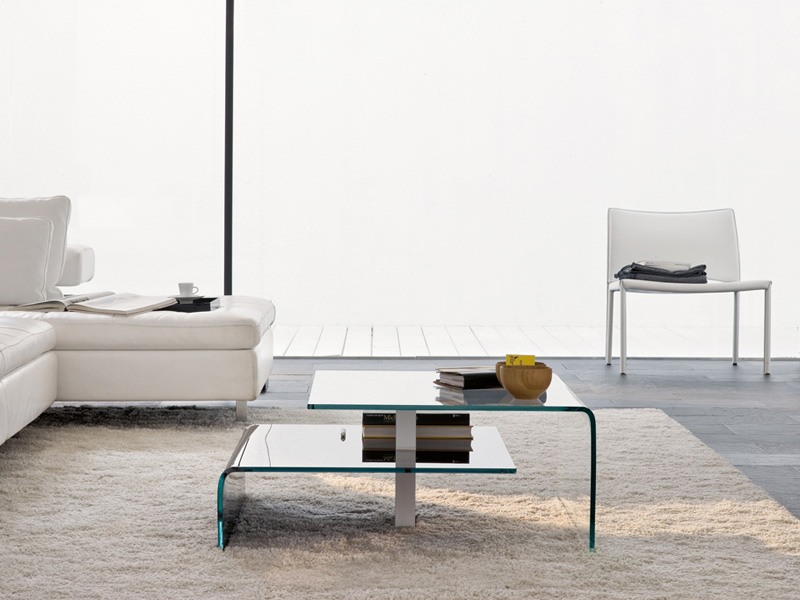 Table basse en verre incurvé. Structure à deux étagères en verre incurvée; supports en aluminium anodisé. Finition disponibles: complètement transparent, transparent avec étagère inférieure peinte en noir. Dimensions:. - L 90, W 90, H 20/33.