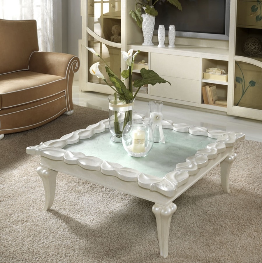 Table basse en bois laquée, avec dessus en verre. Finement décoré.