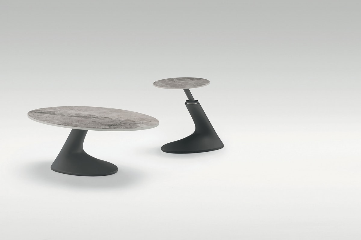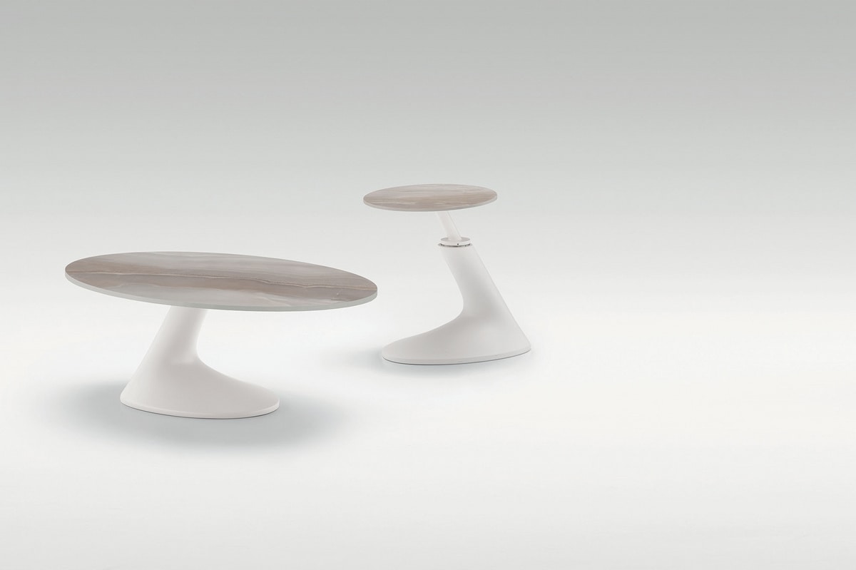Trois tailles: 50, 80 et 110 cm. Base en polyuréthane peint et plateau en grès cérame ou verre trempé transparent.