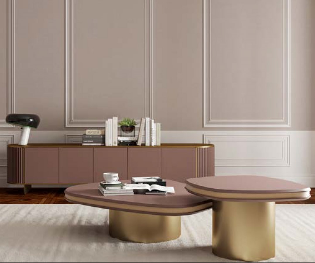 Chaque table basse repose sur un seul piétement cylindrique au diamètre généreux, assurant stabilité et fort impact visuel. Le plateau est constitué d'une structure sandwich en bois laqué de forme irrégulière, qui garantit légèreté et un contraste de couleurs élégant et raffiné.