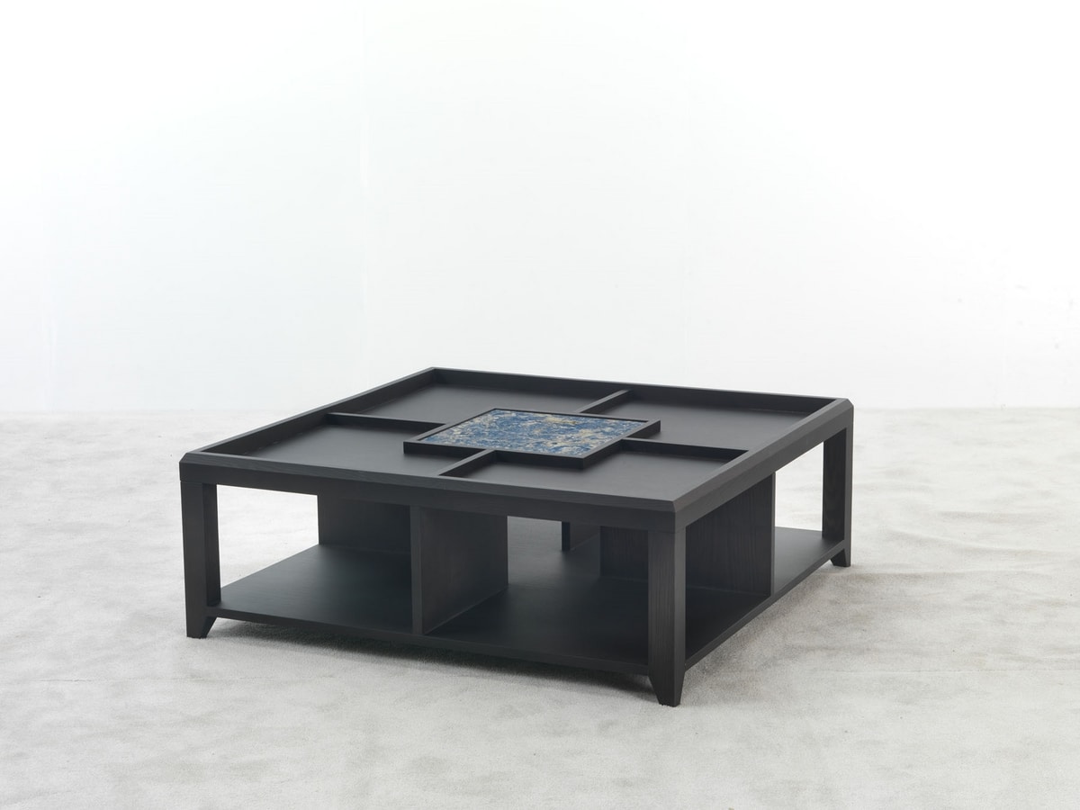 Table basse carrée avec plateaux en contreplaqué plaqué et parties en frêne massif, finition noire urbaine et insert en