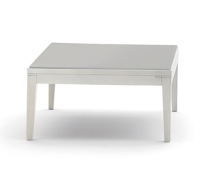 Table bas carrée avec structure en hêtre massif, verre laqué verre trempé, pour les environnements modernes