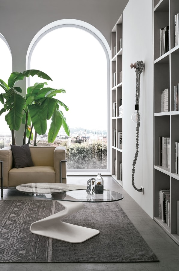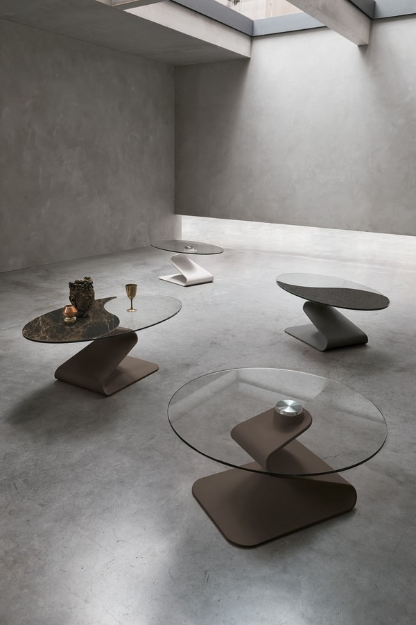 Table basse avec base en polyuréthane peint et plateau en verre trempé ou avec plateau en verre trempé avec détails en grès cérame.