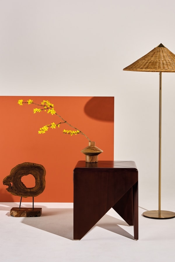 Il y a une petite table née de l'imagination d'un enfant, créé avec des mains qui plient du papier dans un jeu de formes, de couleurs et de rêves. Chaque coin, chaque pli, est une découverte. Une table en origami, un coin du monde construit avec des feuilles de papier qui racontent des histoires invisibles. La table est un symbole de force créative, comme si chaque pli avait le pouvoir de tenir le rire d'une journée d'été. Et donc, sous le soleil, la table d'appoint en teckwood prend vie. Proposé en finition en bois en acajou.